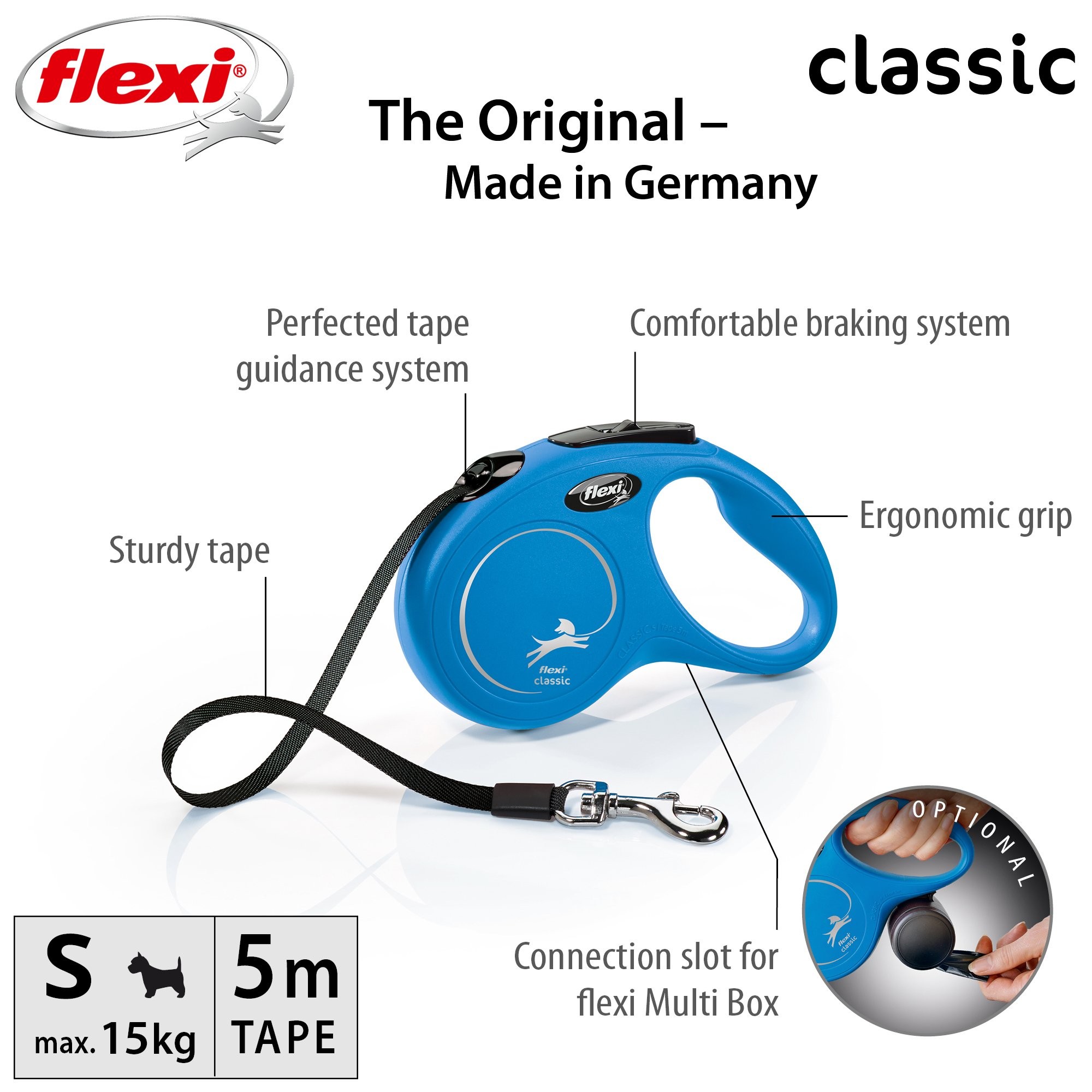 Vodítka flexi® classic nabízí pohodlný úchop, odolný navíjecí systém i kvalitní, bezpečný a intuitivní brzdový systém, který ve zlomku vteřiny zastaví pohyb psa. Pro snadné upevnění vodítka k obojku nebo postroji je vodítko opatřeno chromovanou karabinou. Samozřejmostí je zdokonalený výstup pásku, který zajišťuje manipulaci v libovolném směru bez zasekávání - potvrzeno nesčetnými testy.