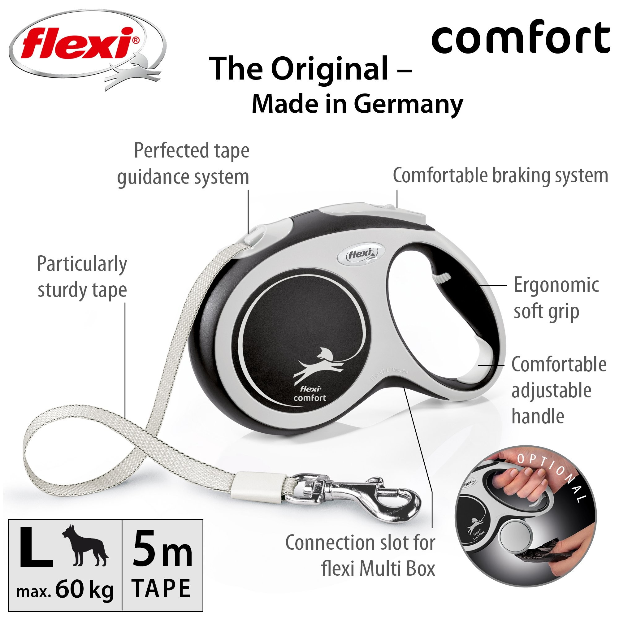 Pohodlné a díky svému dokonale sladěnému designu i unikátní - to je vodítko flexi® comfort, které nabízí Vašemu čtyřnohému příteli vše, co psi milují: pohyb, pohyb a ještě jednou pohyb! Vás jistě potěší extra pohodlná, měkká rukojeť (ve velikosti M a L je navíc nastavitelná) i zdokonalený výstup a vedení pásku všemi směry bez zasekávání. Na každé procházce oceníte i bezpečný a intuitivní brzdový systém, který ve zlomku vteřiny zastaví pohyb psa. Pro snadné upevnění vodítka k obojku nebo postroji je vodítko opatřeno kvalitní chromovanou karabinou.