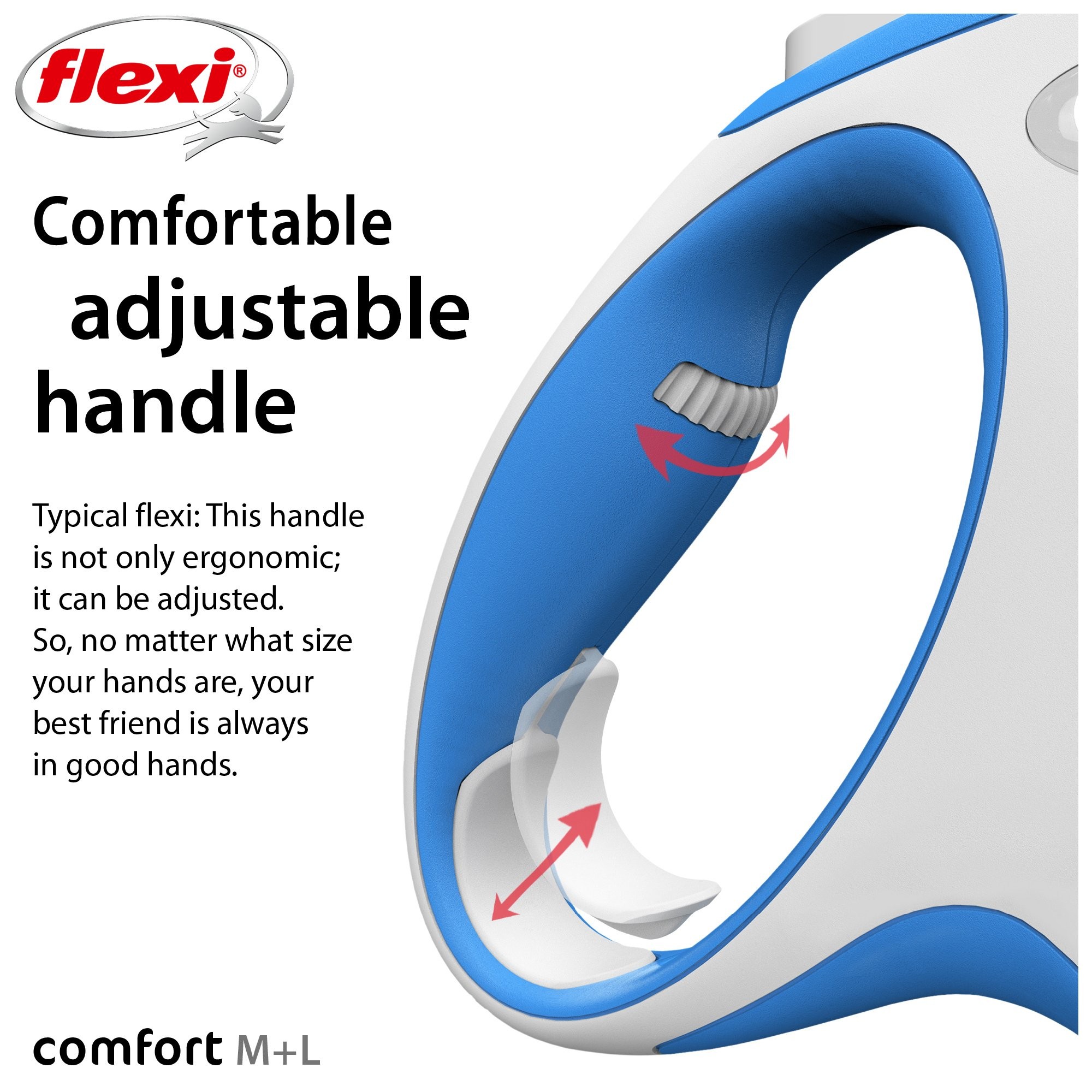 Pohodlné a díky svému dokonale sladěnému designu i unikátní - to je vodítko flexi® comfort, které nabízí Vašemu čtyřnohému příteli vše, co psi milují: pohyb, pohyb a ještě jednou pohyb! Vás jistě potěší extra pohodlná, měkká rukojeť (ve velikosti M a L je navíc nastavitelná) i zdokonalený výstup a vedení pásku všemi směry bez zasekávání. Na každé procházce oceníte i bezpečný a intuitivní brzdový systém, který ve zlomku vteřiny zastaví pohyb psa. Pro snadné upevnění vodítka k obojku nebo postroji je vodítko opatřeno kvalitní chromovanou karabinou.