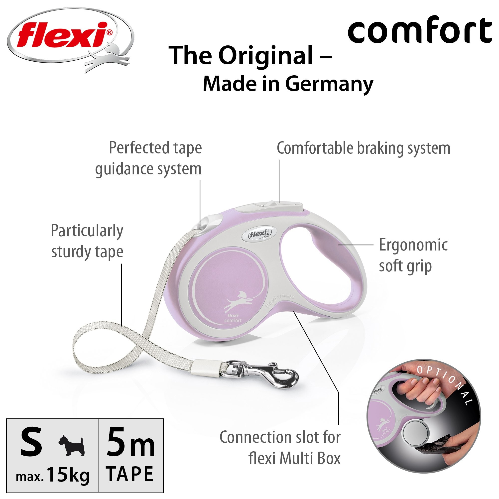 Pohodlné a díky svému dokonale sladěnému designu i unikátní - to je vodítko flexi® comfort, které nabízí Vašemu čtyřnohému příteli vše, co psi milují: pohyb, pohyb a ještě jednou pohyb! Vás jistě potěší extra pohodlná, měkká rukojeť (ve velikosti M a L je navíc nastavitelná) i zdokonalený výstup a vedení pásku všemi směry bez zasekávání. Na každé procházce oceníte i bezpečný a intuitivní brzdový systém, který ve zlomku vteřiny zastaví pohyb psa. Pro snadné upevnění vodítka k obojku nebo postroji je vodítko opatřeno kvalitní chromovanou karabinou.