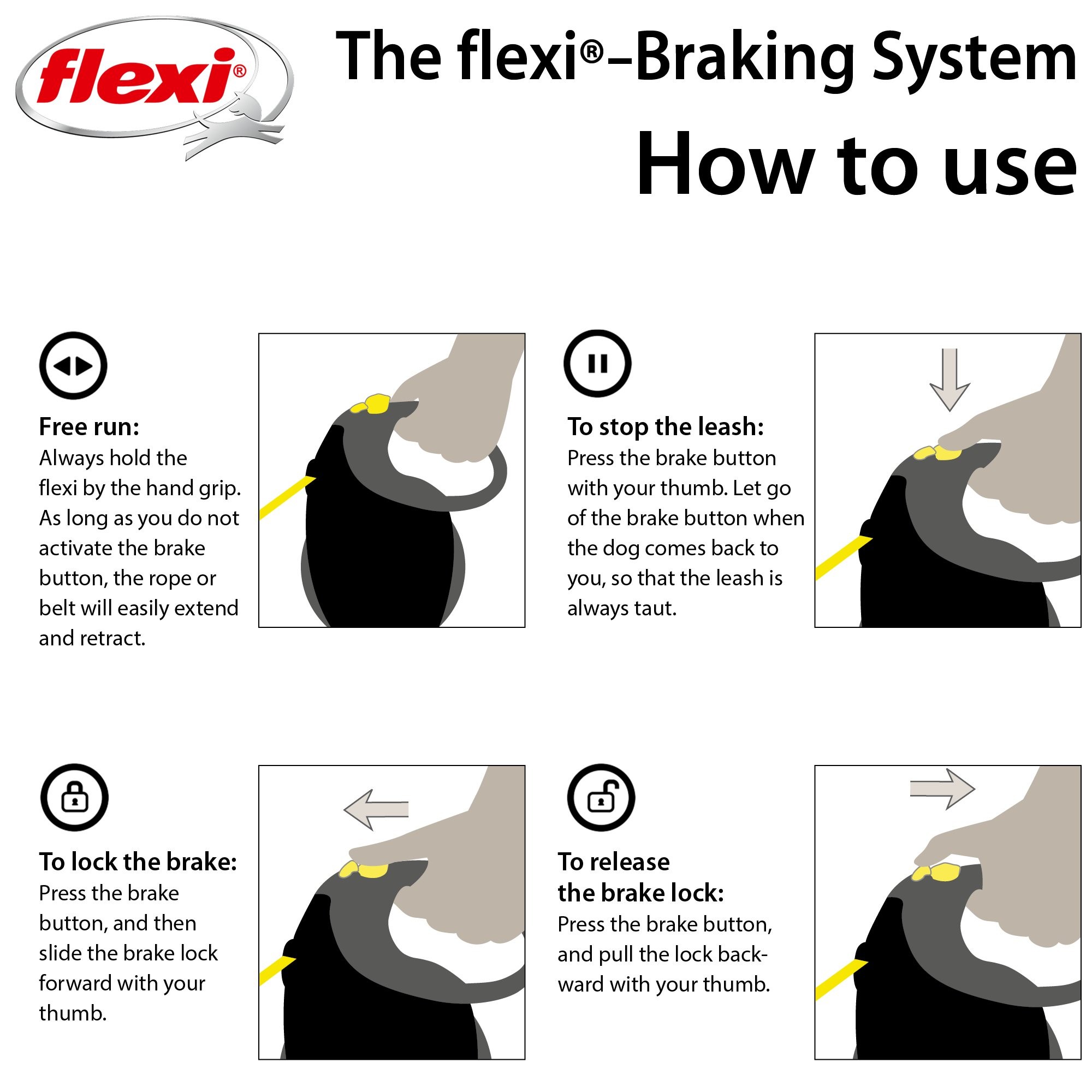 Samonavíjecí vodítko flexi® se nikdy neprověsí. To Vám umožňuje kdykoli zastavit psa stisknutím tlačítka brzdy, bezpečně ho ovládat a přiblížit ho k sobě.