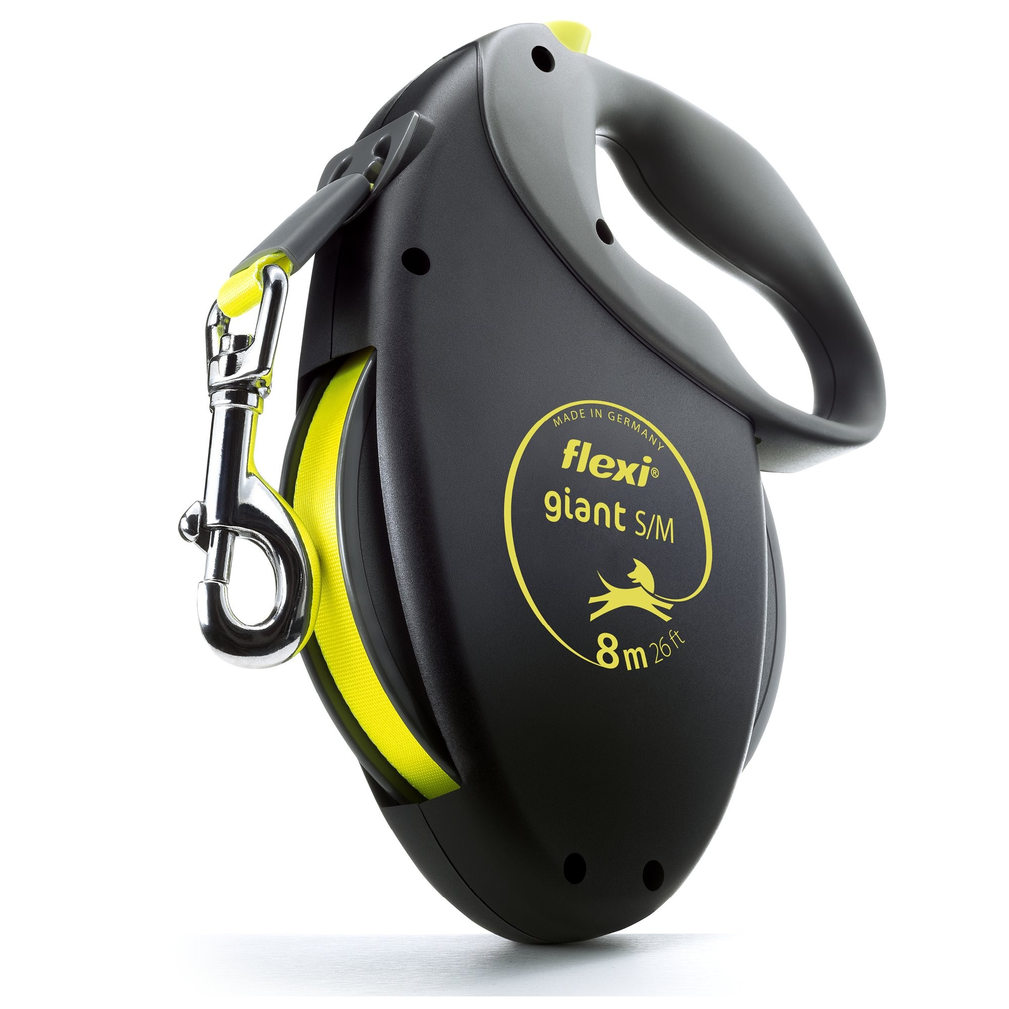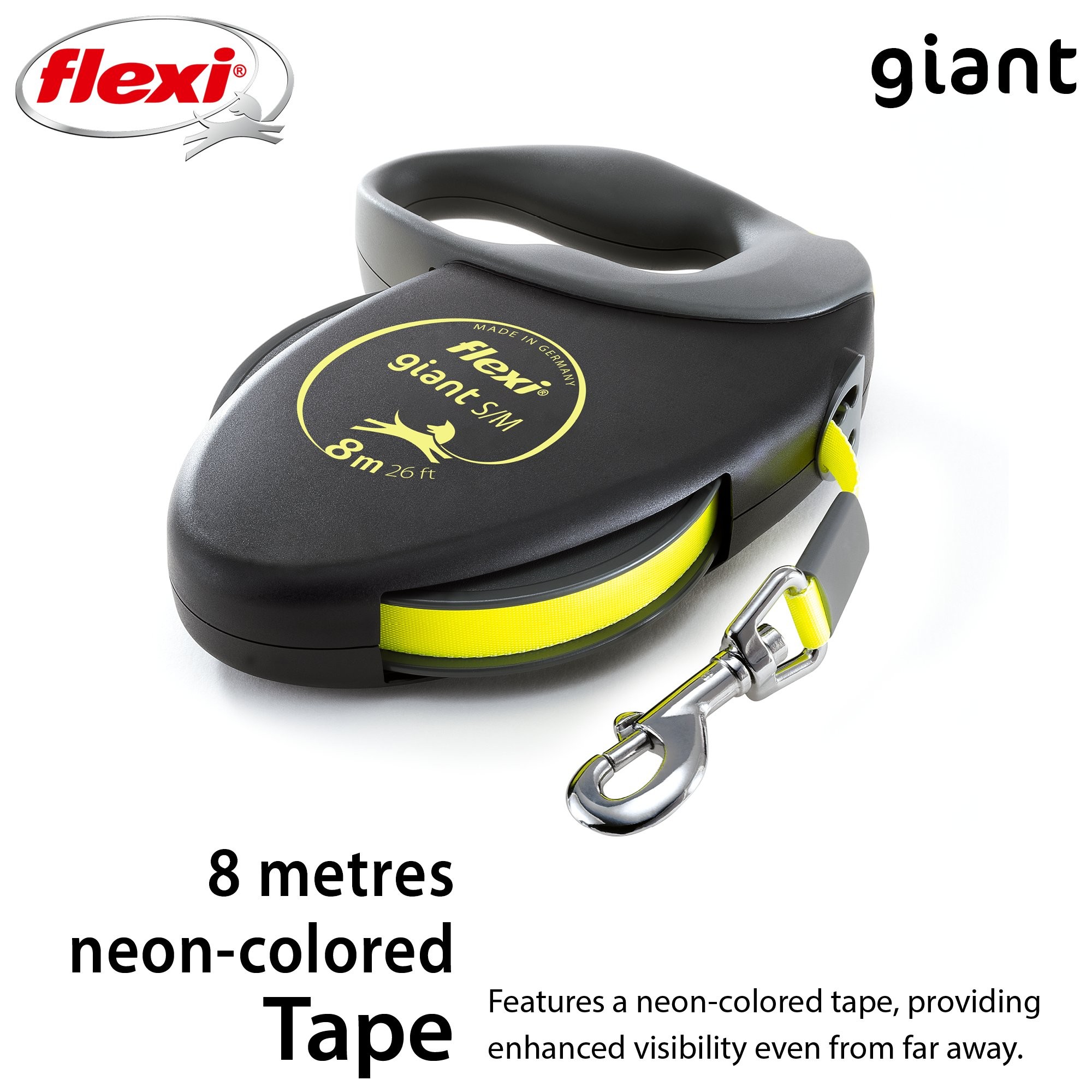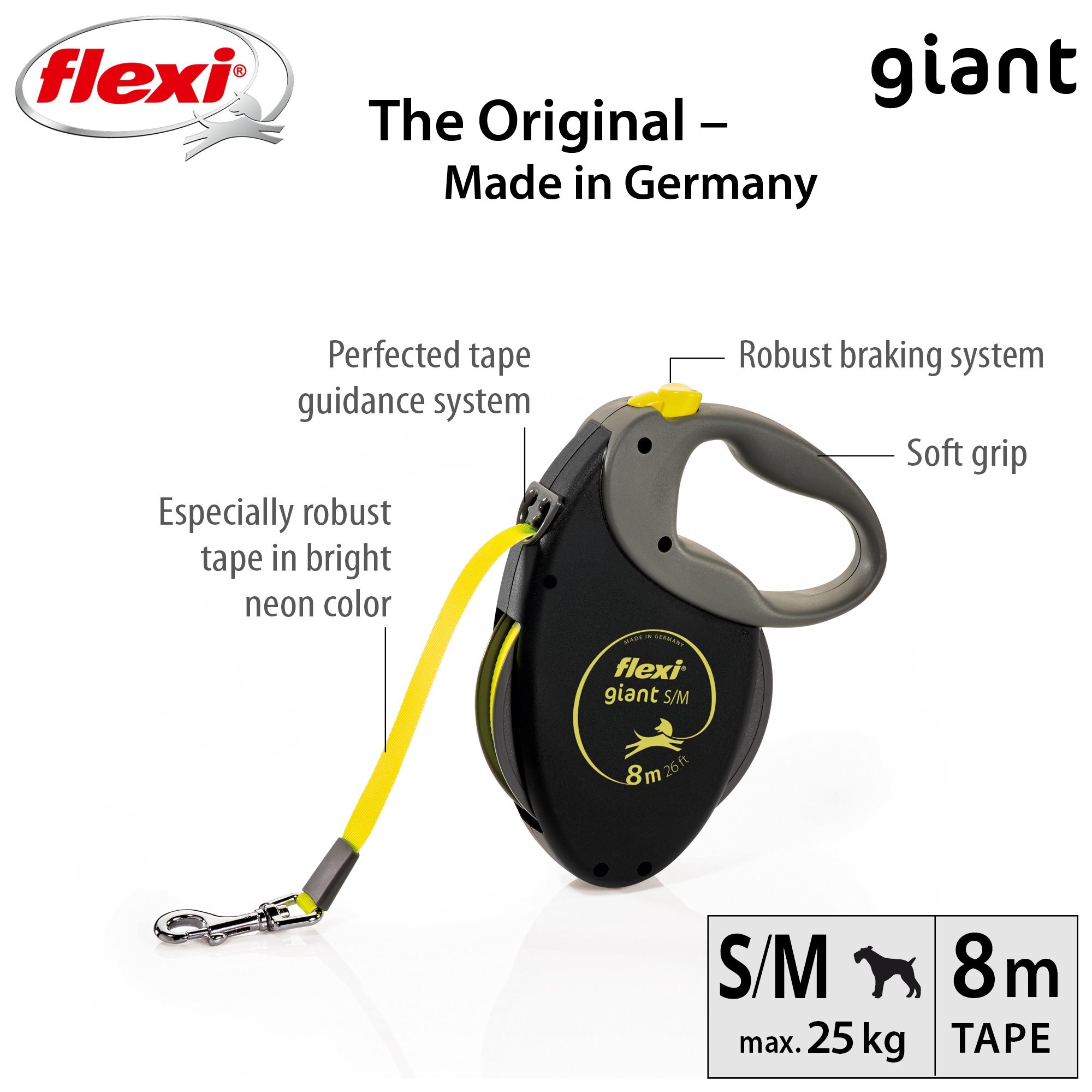 Flexi® má srdce pro velké psy! Vodítko flexi® Giant S/M je navrženo pro silné a aktivní psy až do hmotnosti 25 kg a nabízí volný pohyb do vzdálenosti 8 metrů. A co nabízí Vám? Měkkou rukojeť pro dlouhé výlety a tréninky a mnoho dalších benefitů: