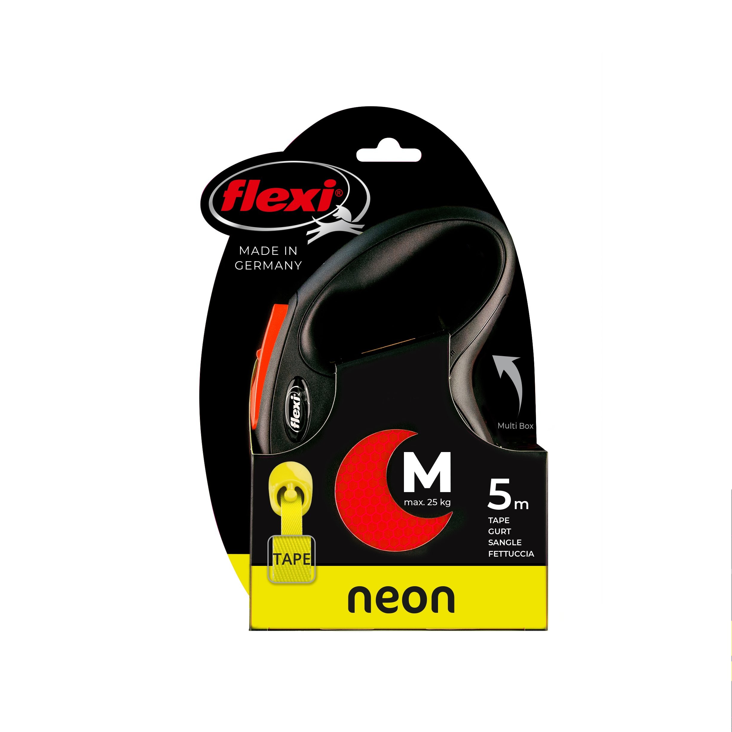 Flexi® Neon zároveň nabízí i nesčetnými testy zdokonalený výstup a vedení pásku všemi směry bez zasekávání. S délkou 5 m poskytuje Vašemu parťákovi potřebnou volnost pohybu.