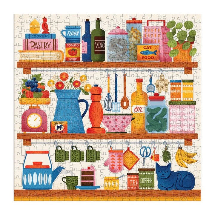 Puzzle zobrazuje ilustrovanou polici s kuchyňskými potřebami. Obsahuje i 15 zábavných tvarovaných dílků, které úhledně zapadají do puzzle. Puzzle je baleno v pevné krabici, pro opětovné použití a skladování. Ideální jako dárek.  Puzzle jsou vyrobeny za použití významného podílu recyklovaného papíru a nabízí špičkový potisk nezávadnými barvami. Jsou opatřeny matnou povrchovou úpravou, která zajišťuje za všech okolností věrné podání detailů i barev. Jejich zadní strana je potažena hladkým, na dotek příjemným povrchem, díky němuž se při skladování rozloženého puzzle netvoří prach. Spolu s pečlivě zabalenými dílky naleznete v balení také letáček s návodným obrázkem, který zpravidla obsahuje další informace o tvůrcích a pozadí vzniku díla. Dodáváno v mimořádně pevné a poutavě zpracované kartonové krabičce vyrobené z recyklovaného kartonu a udržitelně získaných materiálů s certifikací FSC®. Hlavní vlastnosti: 500 precizně vyřezaných dílkůvyrobeno s použitím recyklovaných a udržitelně získaných materiálůpečlivě vybraný motiv od renomovaných tvůrců a umělcůpotisk a provedení nejvyšší kvalityobsahuje návodný obrázek