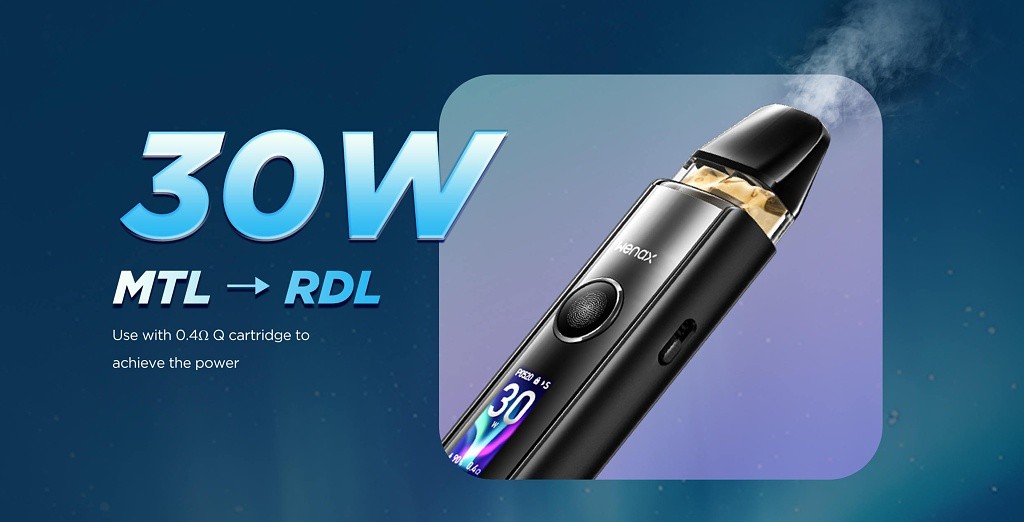 Pod systém s dotykovým panelem a haptickou odezvou, 1200mAh baterie, výkon až 30W, barevný displej 0,96". MTL/RDL vaping, Pod Cartridge 2ml, USB-C nabíjení 2A, cartridge 0,6Ω a 0,8Ω. Elegantní design s mesh technologií. Barva: Starlight Grey