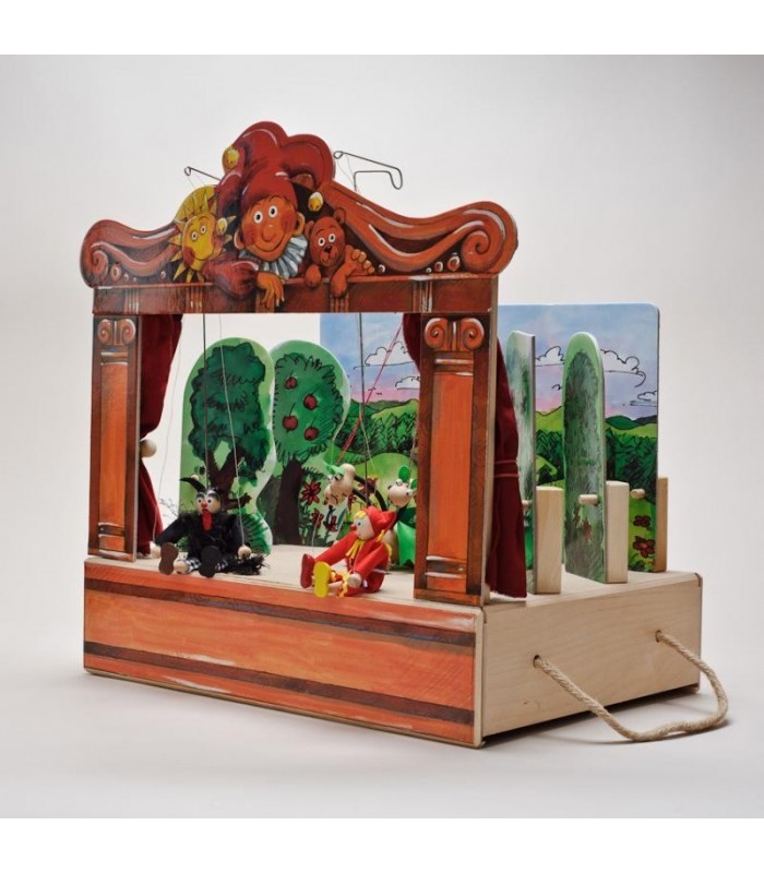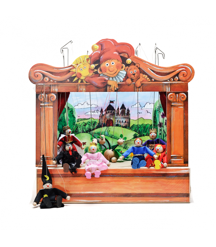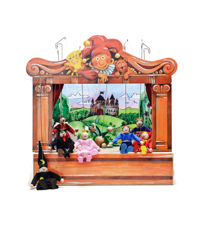 Půvabné dřevěné loutkové divadlo pro vaše děti. Ponořte se spolu s dětmi do světa nejznámějších českých pohádek. Vhodné pro děti od 3 let. Krásně propracované dřevěné loutkové divadlo s jednotlivými loutkami, probudí u Vašich dětí fantazii, posílí paměťové a výrazové schopnosti. Velikost loutkového divadla: 46 x 41 x 32 cm Velikost loutky: 12-15 cm Sestava obsahuje dřevěnou krabici, 8 dřevěných loutek, 4 scény, proscenium s veselým kašpárkem a oponu. Loutky se mohou lišit v barevných detailech. Obsahuje oboustranné kulisy: Na zámku / Před zámkem U jeskyně / V pekle Obsahuje loutky: Král Ferdinand Královna Alžběta Princezna Anička Princ Slavomír Tříhlavý drak Čertík Bruno Čaroděj Vilém Kašpárek Celá loutková sestava je zabalena v praktickém dřevěném kufříku s posuvným víkem. Hlavní vlastnosti: Dřevěné divadlo s 2 oboustrannými kulisami a 8 loutkamiRučně vyráběné loutkyRozměry hlavní scény jsou 40x23 cm, rozměry bočních kulis jsou 9,5x23 cmDivadlo lze rozšířit o další loutky a kulisy