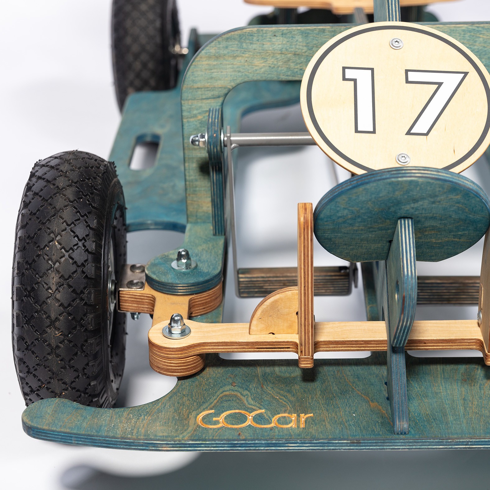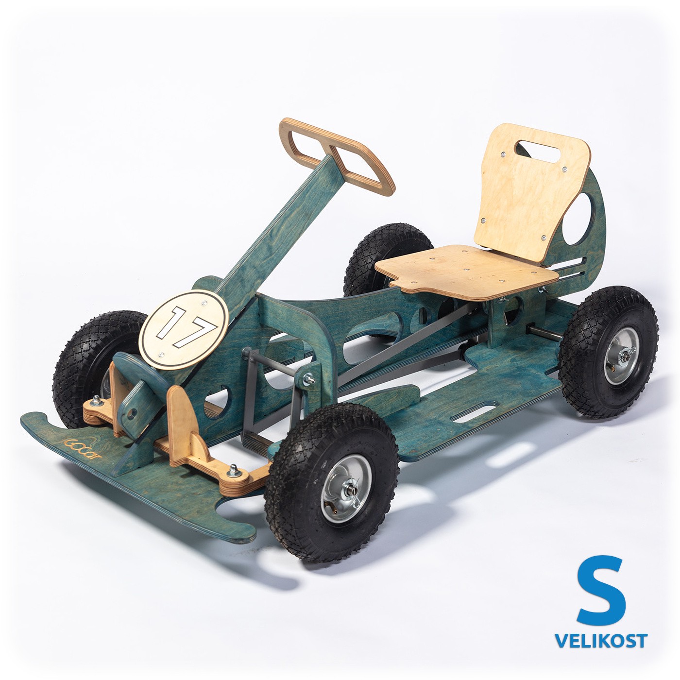 Šlapací autíčko GOCar je zábavnou výzvou jak pro tatínky, kteří si při jeho stavbě umí odpočinout, tak pro ratolesti toužící držet volant, učit se pravidlům provozu i závodění. Základem maximálně ekologické konstrukce vozítka je bezkazová, pevná a odolná březová překližka původem z Lotyšska, která byla důkladně ošetřena voskovým olejem, a odolá tak povětrnostním vlivům. Odolnost vůči nepřízni prostředí také zajišťují díly z nerezové oceli a robustní plastová kluzná ložiska. Šlapací mechanika je přizpůsobena omezenému prostoru a maximální bezpečnosti. Dynamice jízdy prospívají objemná nafukovací pojezdová kola. K zajištění řidičova pohodlí je autíčko vybaveno posuvným opěradlem. Autíčko velikosti S (malé), má nosnost do 50 kg a je určeno pro děti od 3 do 5 let.   Hlavní vlastnosti:pro děti od 3 do 5 let, max. 50 kgodolná konstrukceve formě stavebnice