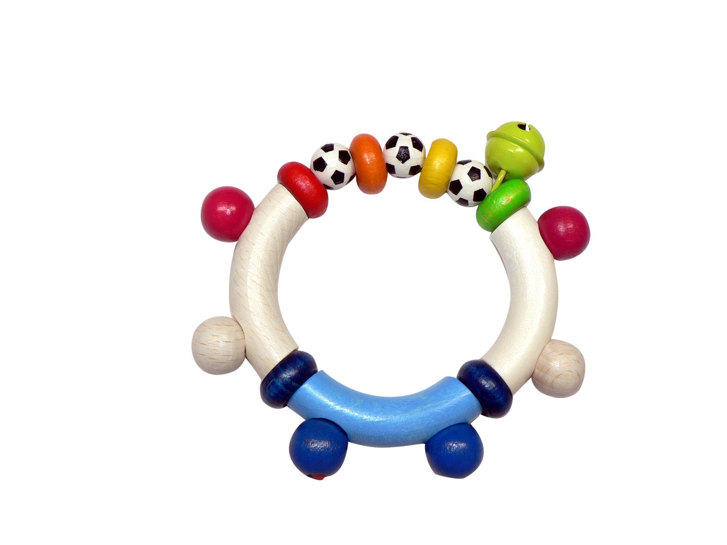 Chrastítko barevné s dřevěnými prvky a rolničkou. Vysoce kvalitní dřevěné chrastítko povzbuzuje fantazii a zaujme svým moderním designem. Hlavní vlastnosti: hravým způsobem povzbuzuje fantazii a trénuje obratnost dítěte