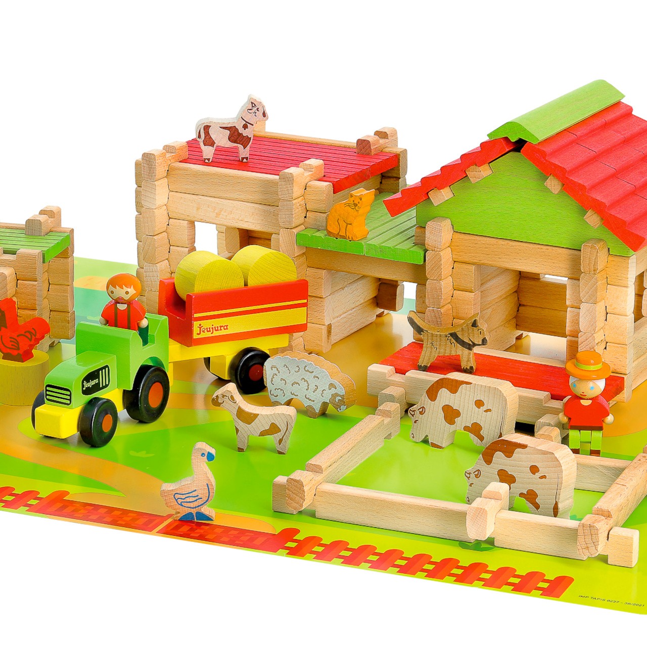 Dřevěná stavebnice, která seznámí malé stavitele se životem na farmě, stane se ozdobou dětského pokoje. Stavebnice Jeujura Constructions mají dlouhou tradici a patří mezi klasické francouzské hračky. Nabízí série tématicky věnované chaletám, domkům a farmám, ale také divokému západu a středověku. Dají se mezi sebou volně kombinovat a k řadě z nich je také nabízeno příslušenství, figurky a vozidla. Jsou vyráběny ve Francii, z masivního bukového a borovicového dřeva francouzského původu. Dílky stavebnic jsou ošetřeny výhradně za použití barev a laků na bázi vody. Každá sada je balena v praktickém lepenkovém kufříku potištěném rostlinnými inkousty a součástí balení je snadno pochopitelný návod. Hlavní vlastnosti: 130 dílků z masivního dřeva a podložkapraktické balenívyrobeno ve Francii