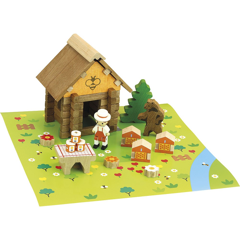 Dřevěná stavebnice včelína rozvíjí fantazii a stane se ozdobou dětského pokoje. Stavebnice Jeujura Constructions mají dlouhou tradici a patří mezi klasické francouzské hračky. Nabízí série tématicky věnované chaletám, domkům a farmám, ale také divokému západu a středověku. Dají se mezi sebou volně kombinovat a k řadě z nich je také nabízeno příslušenství, figurky a vozidla. Jsou vyráběny ve Francii, z masivního bukového a borovicového dřeva francouzského původu. Dílky jsou ošetřeny výhradně za použití barev a laků na bázi vody. Každá sada je balena v praktickém lepenkovém kufříku potištěném rostlinnými inkousty a součástí balení je snadno pochopitelný návod.   Hlavní vlastnosti:50 dílků z masivního dřeva a podložkapraktické balenívyrobeno ve Francii