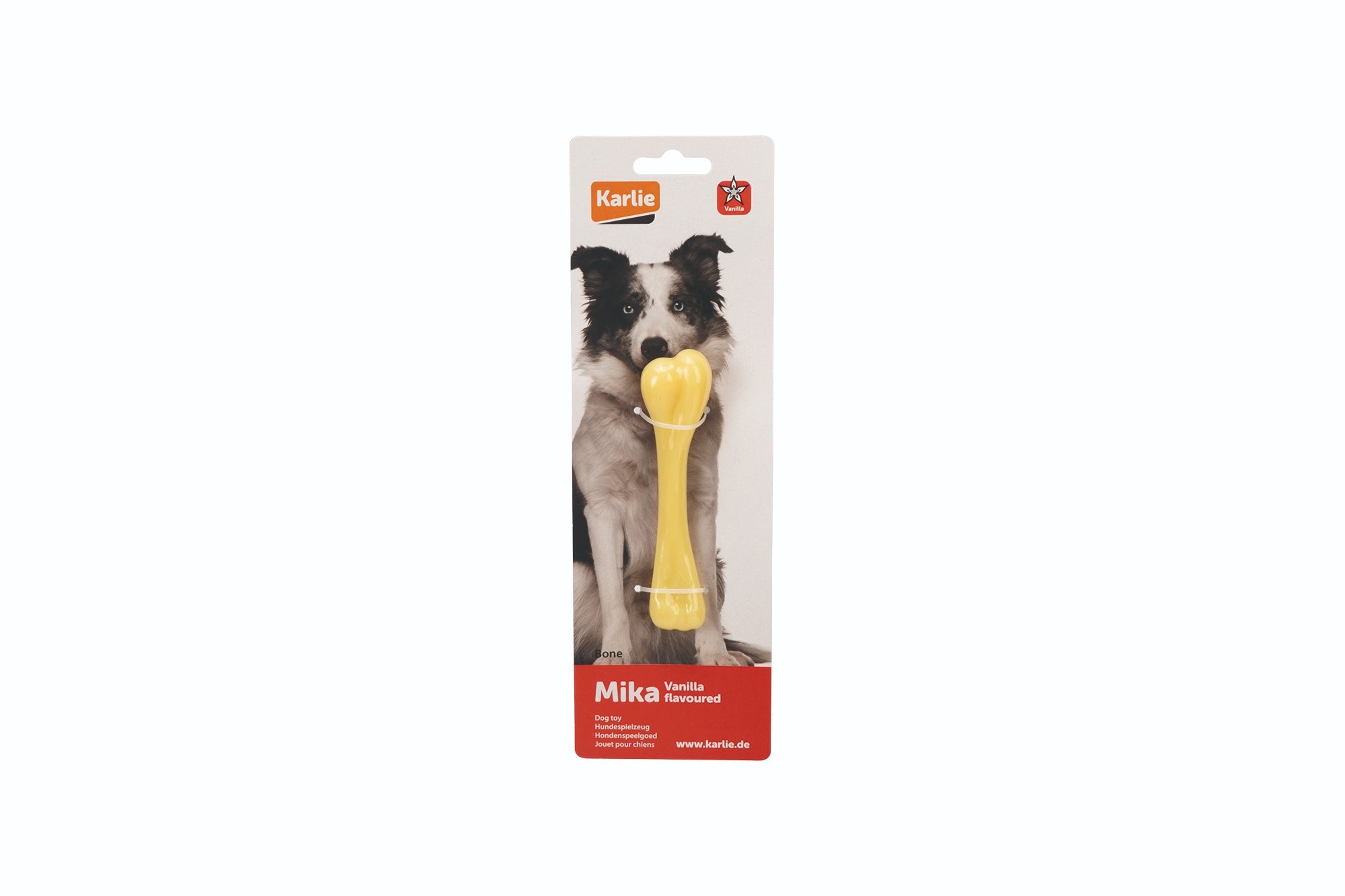 Pevná žvýkací kost vyrobená z odolného nylonu. Kost je vhodná pro zubní péči. Při žvýkání se trvale tvoří rýhy, které odstraňují zubní kámen. Vanilková příchuť, bez alergenů.
