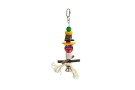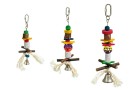 Barevná dřevěná houpací hračka pro ptáky se zvonečkem z přírodních materiálů.