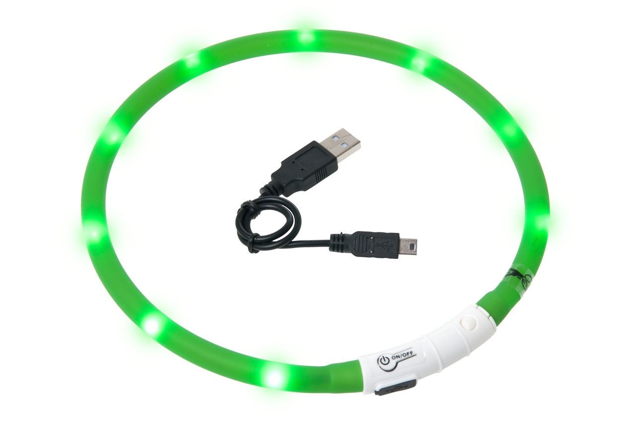 LED světelný obojek zelený viditelný až cca 500 m. Dobíjecí baterie pomocí USB kabelu - žádné jiné baterie nutné - voděodolná - blikající světlo nebo kontinuální světlo. Velikost 20-70 cm Celý popis
