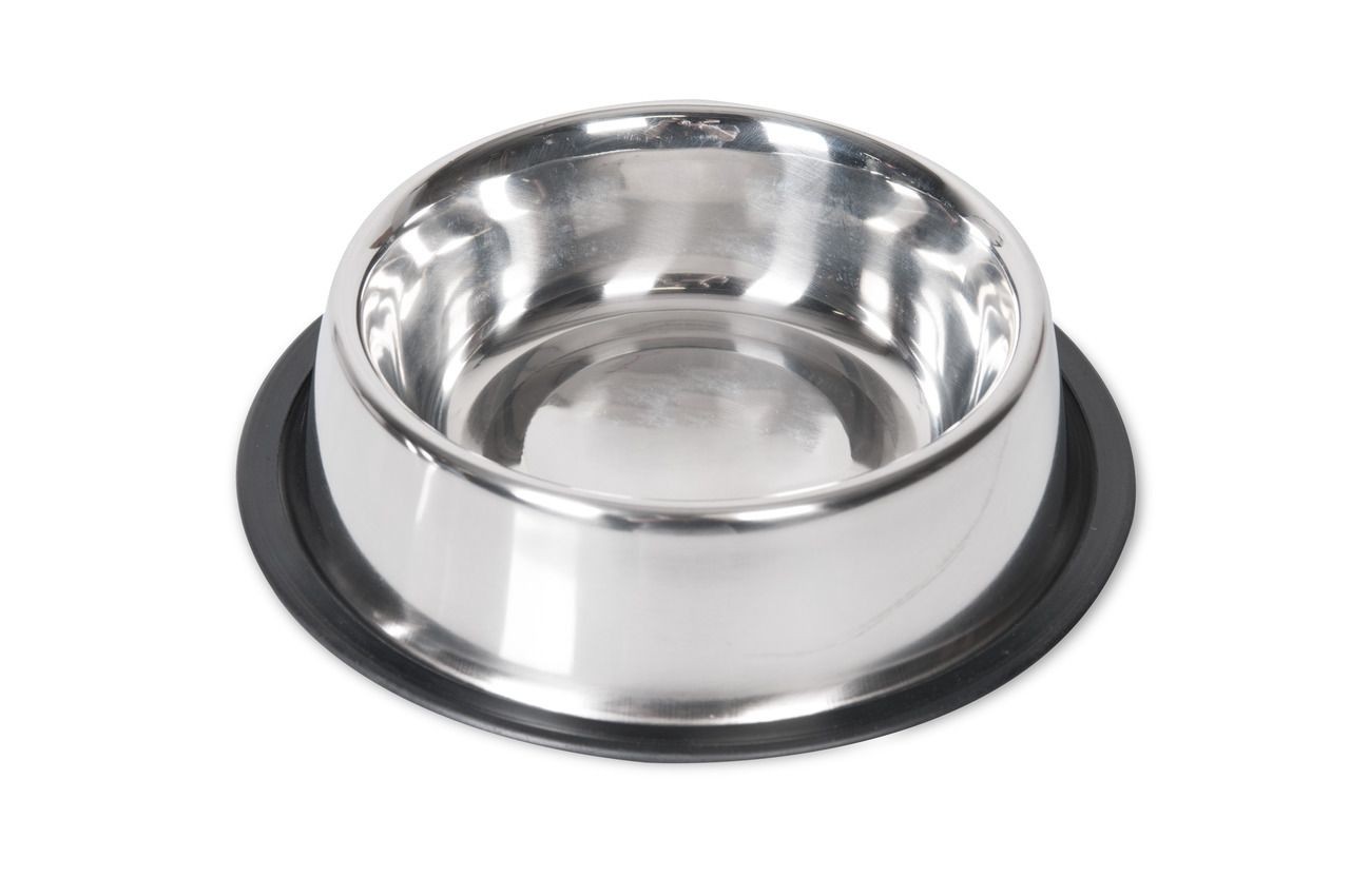 Praktická nerezová miska s gumovým okrajem, která zabrání skluzu po podlaze. Velikost 18cm 900ml