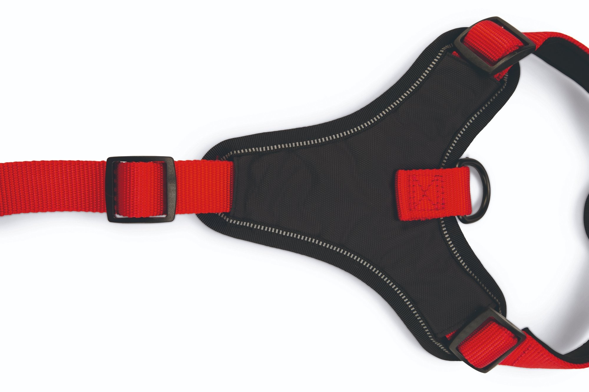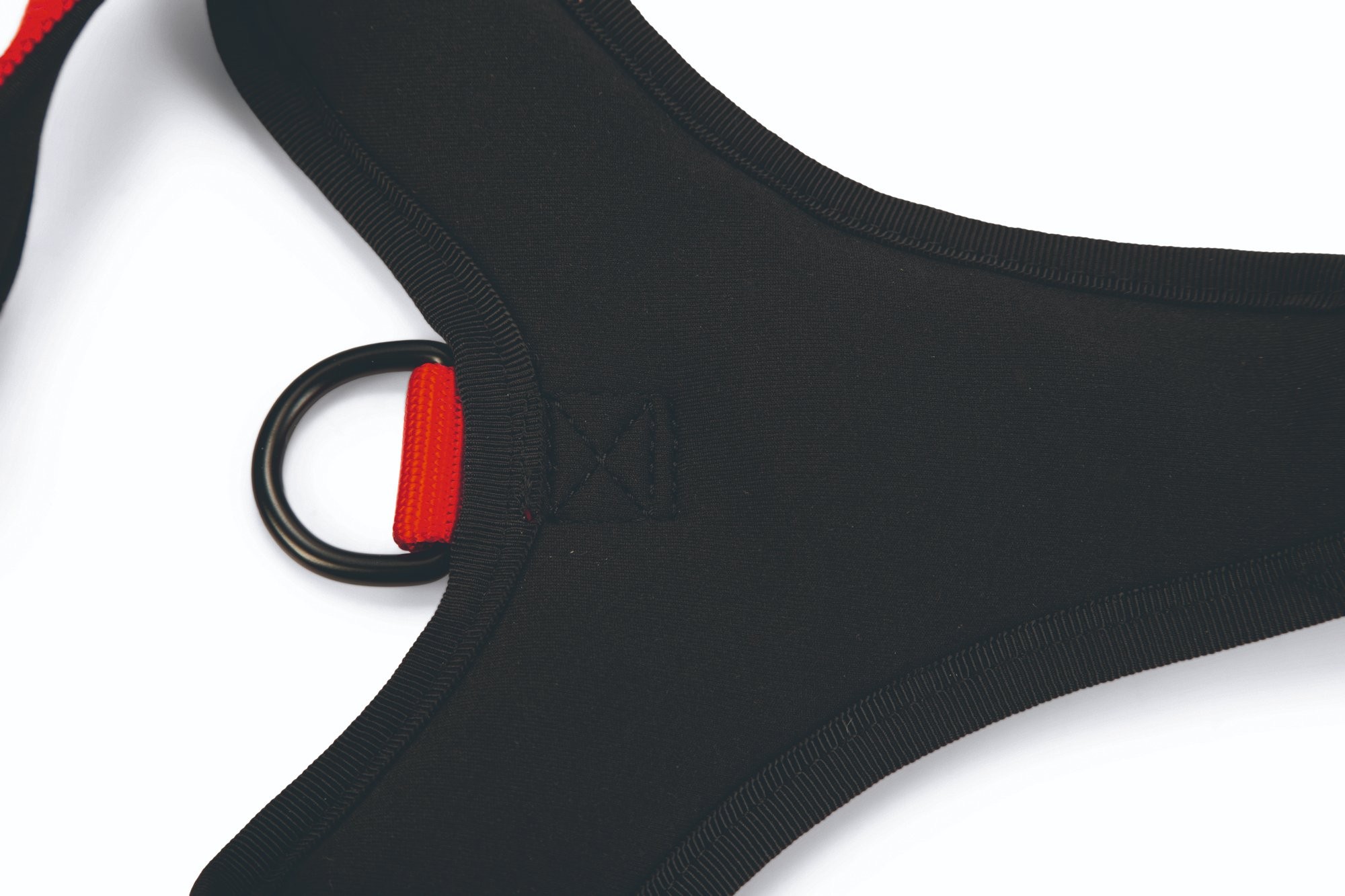 Nastavitelný postroj s hrudním panelem ve tvaru "Y" pro optimální rozložení tlaku. Je podšitý rychleschnoucím neoprenem odolným vůči nečistotám. Dvě možnosti připevnění vodítka - na zádech a v oblasti hrudníku.