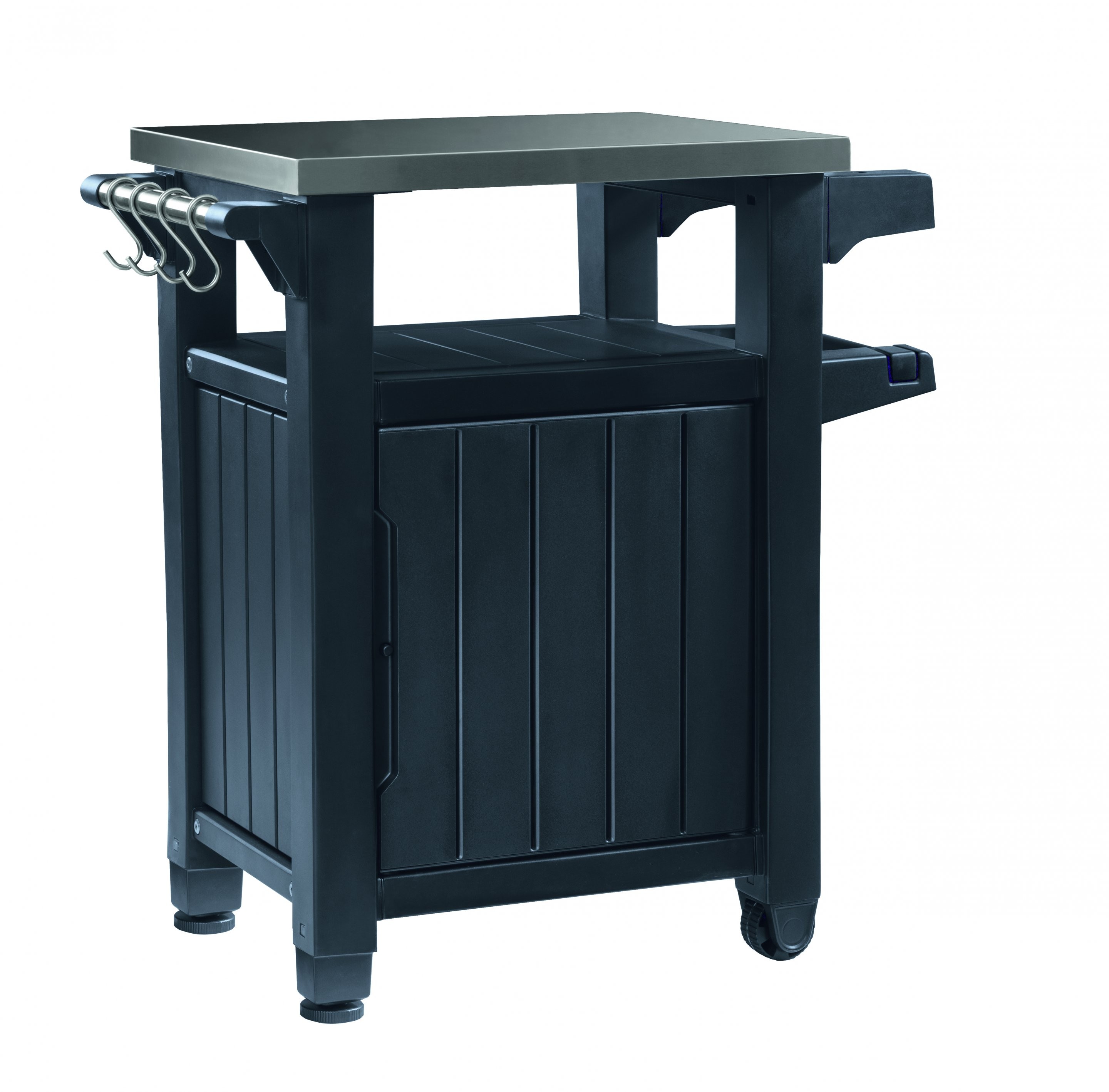 Grafitový grilovací stolek Unity značky Keter má kapacitu 105 litrů. Nerezová pracovní deska, praktická rukojeť s háčky na pověšení utěrek a kolečka pro přemisťování stolku dohromady vytvářejí dokonalé prostředí pro venkovní grilování.