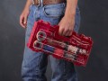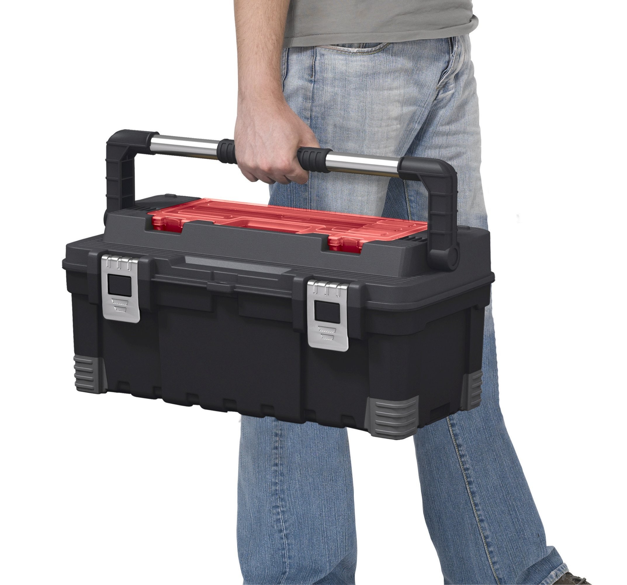 Praktická skříňka s velkým objemem. Její vnitřek umožňuje skladování nářadí různých velikostí. Organizéry uvnitř skříňky usnadňují organizaci práce a zajišťují snadný přístup k potřebnému nářadí. Díky pohodlnému držadlu lze skříňku bez problému přenášet.