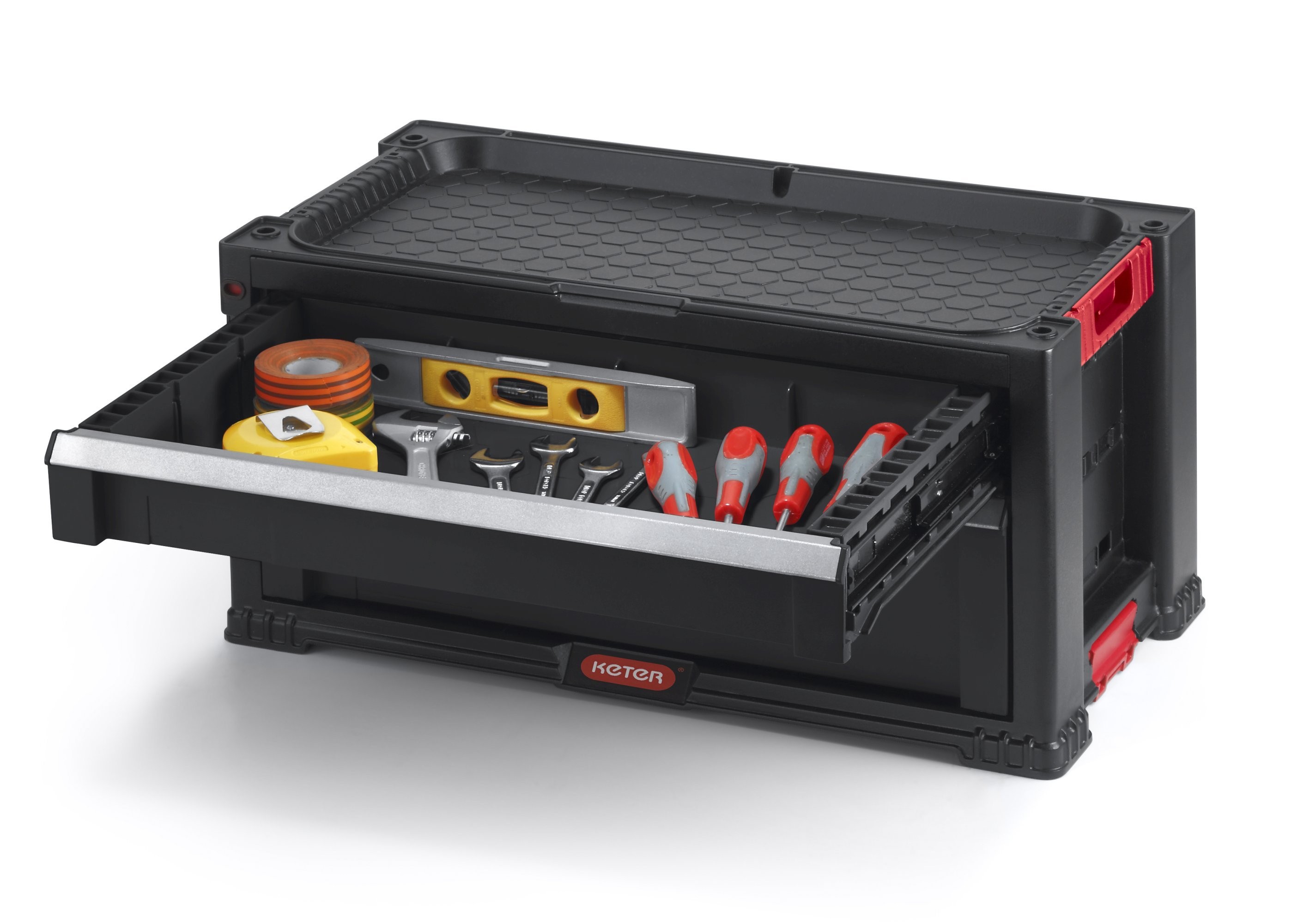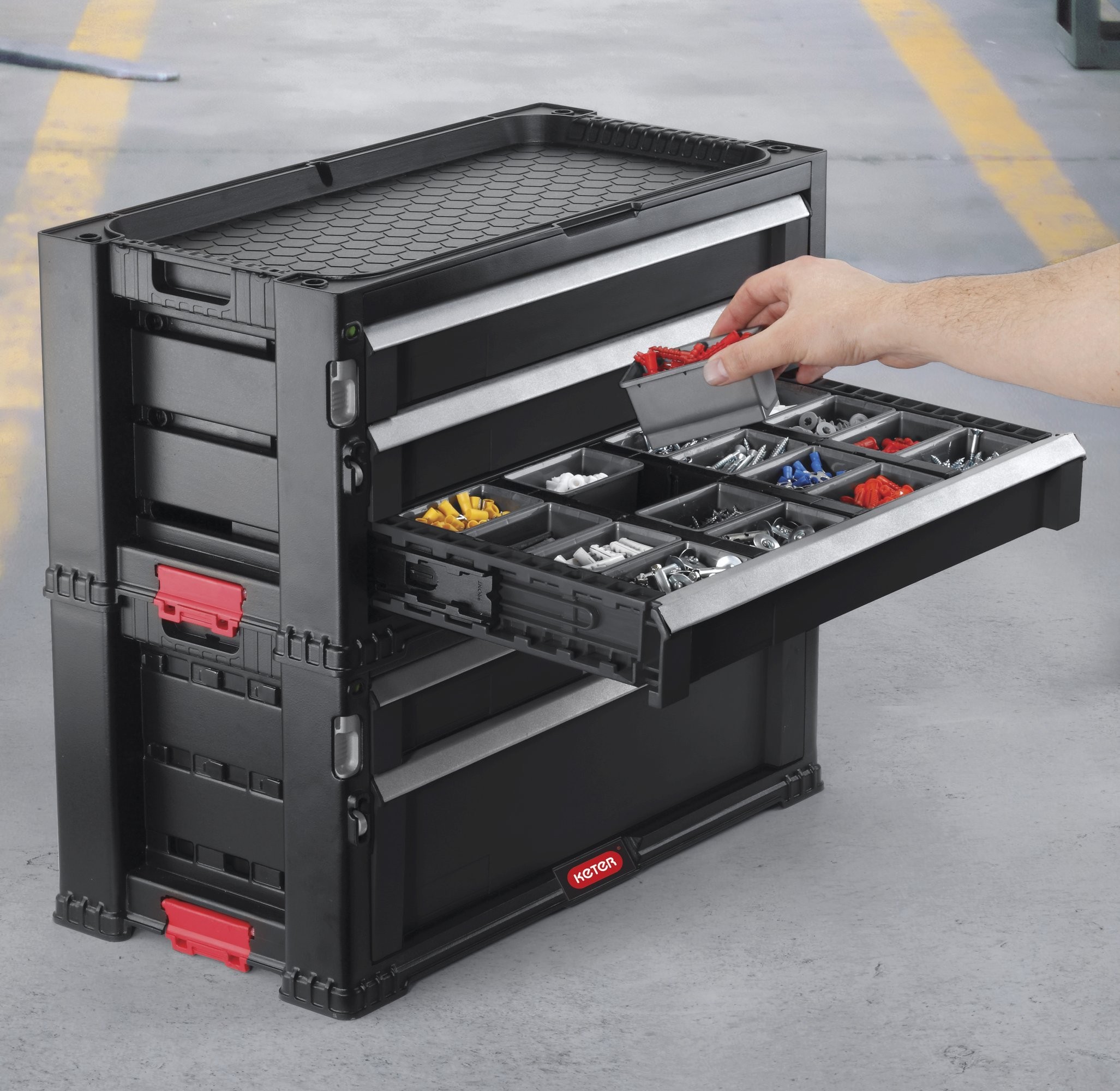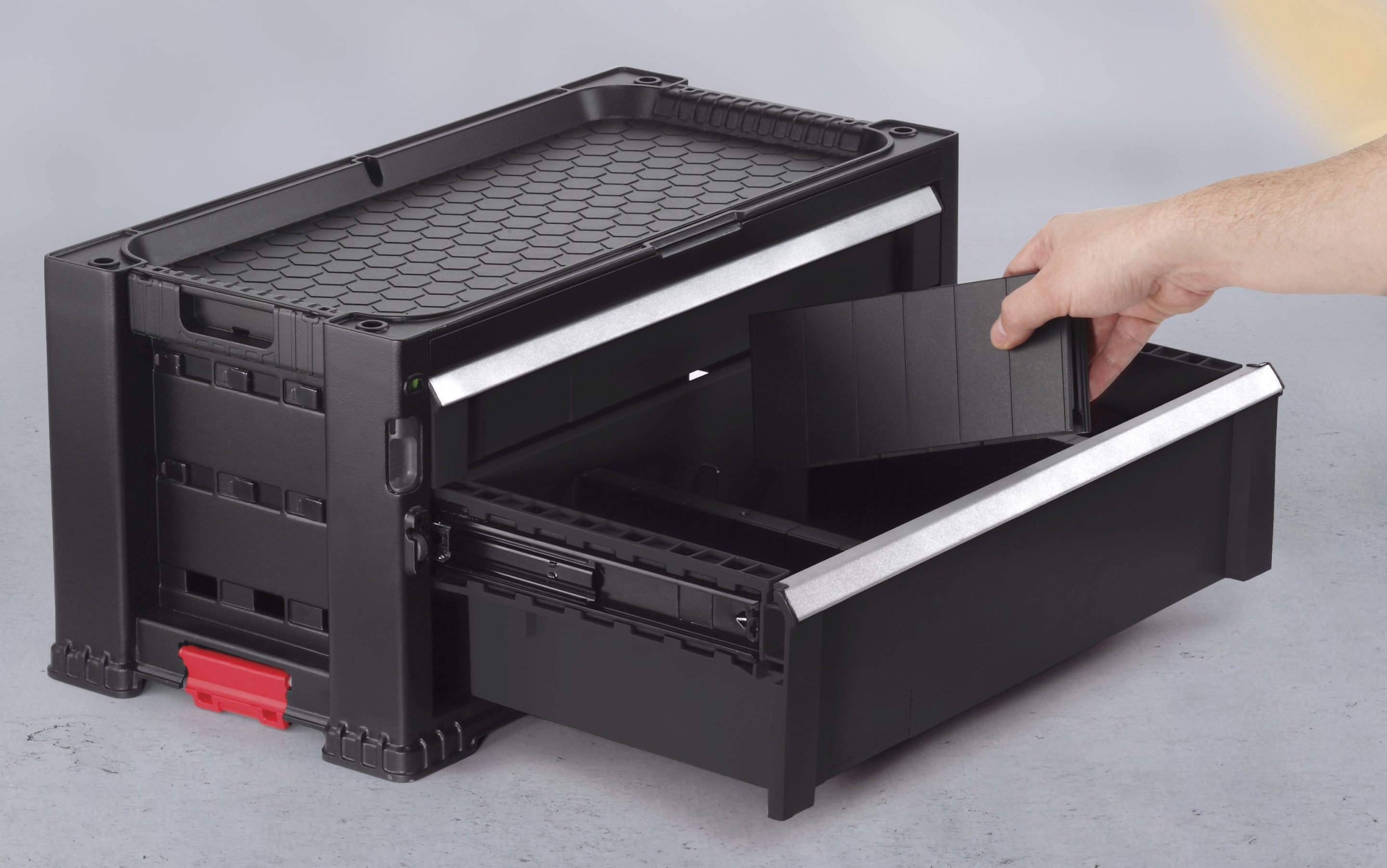 2zásuvková skříňka na nářadí. Obsahuje hlubokou zásuvku s vyjímatelnou přepážkou na větší a těžší nářadí. Praktická police s velkým objemem, která umožňuje uskladnit nářadí různé velikosti v pohodlných přepážkách. Výrobek disponuje 2 objemnými zásuvkami, což umožňuje seskupování předmětů. Hluboká zásuvka s vyjímatelnými přepážkami usnadňuje skladování větších a těžších nástrojů. Ostatní menší zásuvky jsou určeny na jiné nástroje, menší předměty a doplňky.