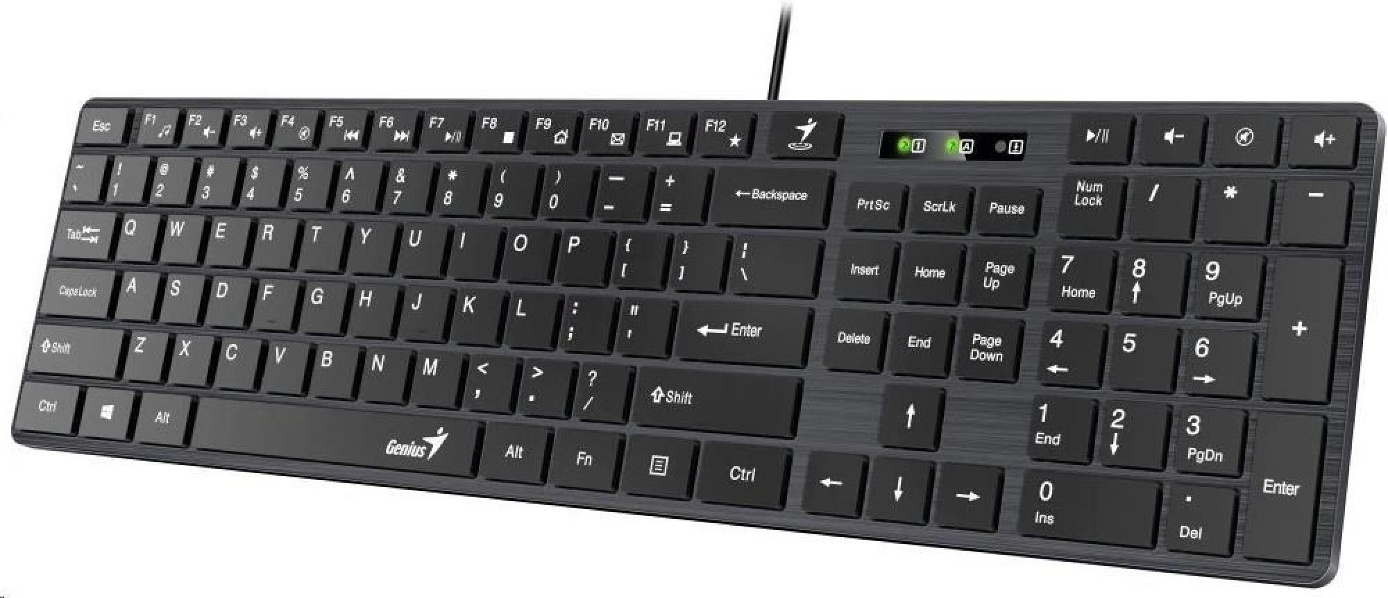 Elegantní drátová klávesnice v černém provedení disponuje tenkým profilem a komfortním jemným sklonem. Díky tomu poskytuje uživateli maximální pohodlí při každodenní práci. Předností jsou také multimediální klávesy pro ztlumení zvuku, otevření E-mailu apod. Díky podpoře aplikace Smart Genius je možné si funkci některých kláves přizpůsobit. Připojení k počítači je realizováno skrze USB port.