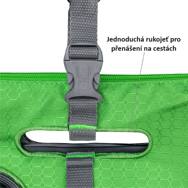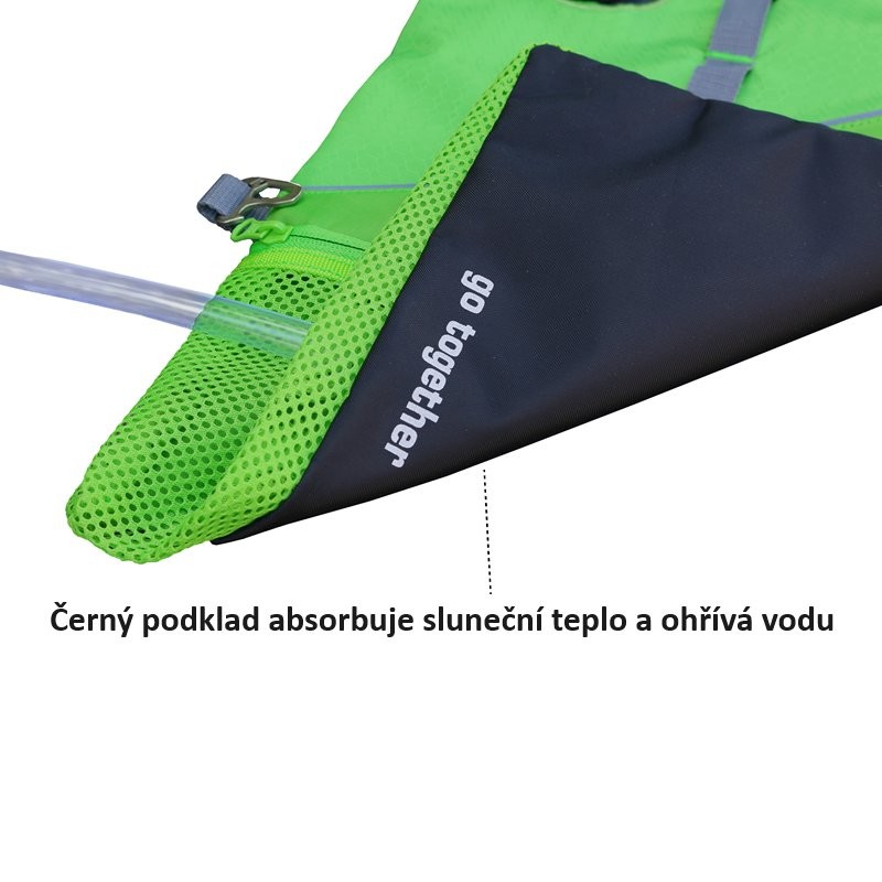 Návod k použití: K naplnění otevřete šroubovací uzávěr na přední straně sáčku a naplňte měch vodou. Pokud plánujete ohřívat vodu, budete muset předtím mech vyjmout ze sáčku k jeho naplnění. Po naplnění můžete naplněný měch položit na slunce nebo zavěsit. Nikdy nezapomeňte otestovat teplotu vody před použitím vody na štěně nebo psa. Zavěste sprchovou tašku na požadované místo pomocí popruhu nebo rukojeti v horní části tašky. Ujistěte se, že sáček je zavěšen dostatečně vysoko, aby hadice směřovala dolů. Tím se zajistí správný průtok vody. Chcete-li vypustit vodu, vytáhněte šedou sprchovou hlavici směrem ven. Chcete-li zastavit vodu, zatlačte šedou sprchovou hlavice dovnitř. K uložení zajistěte hadici pomocí suchého zipu na boku kapsy a ujistěte se, že sprchová hlavice směřuje nahoru. Chcete-li měch na vodu vysušit, otevřete šroubovací uzávěr na přední straně a zavěste jej k vysušení. Hadici lze také odstranit, aby se urychlilo její sušení. Pokud je hadice ohnutá, před prvním použitím ji umístěte naplocho na teplé místo.