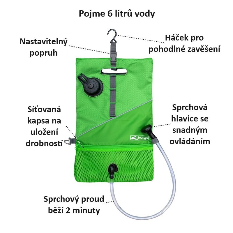 Její 6l objem představuje více než dvě minuty sprchování a nastavitelný popruh usnadňuje zavěšení sprchy na dveře auta, na větev stromu nebo cokoli, co je po ruce. Nezabere mnoho místa, snadno se přenáší a snadno používá.