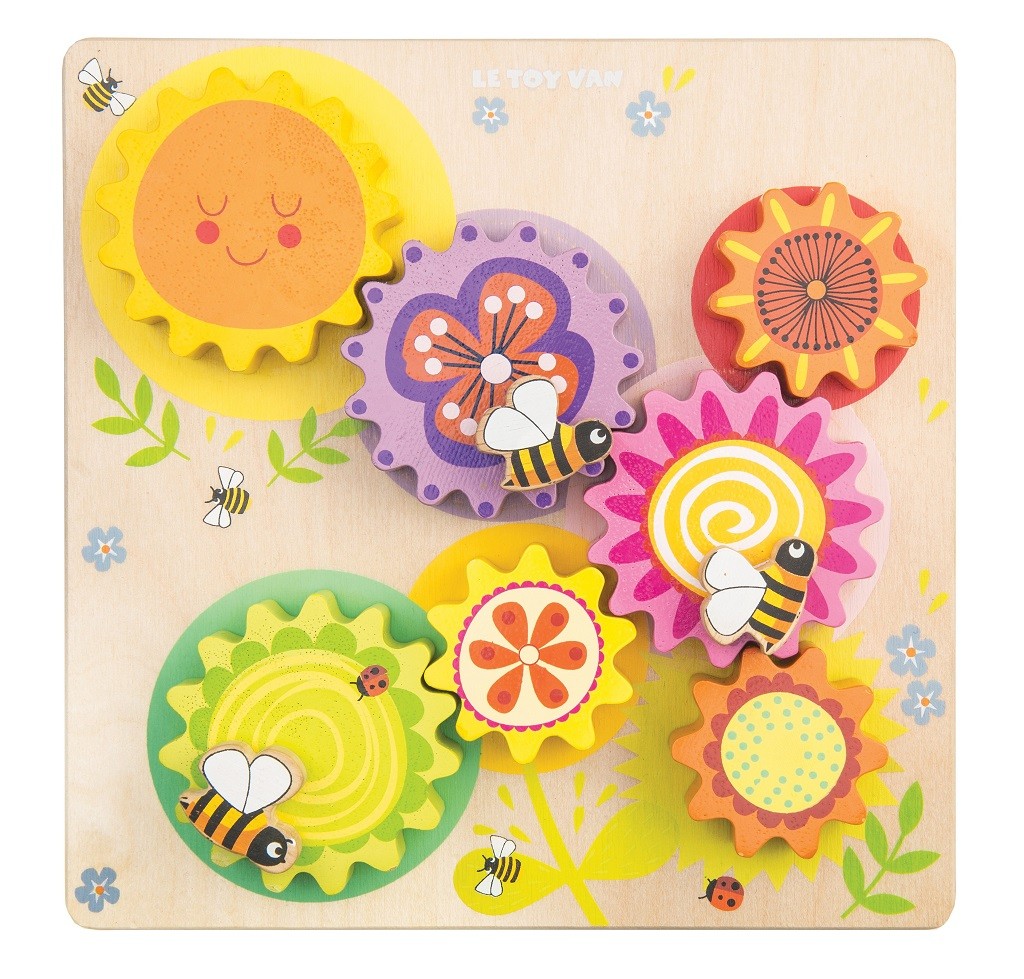 Tato pestrá ozubená kolečka s ilustracemi mohou doplnit kolekci hraček i vašeho dítěte. Kolečka jsou připevněná na dřevěné desce, ilustrovaná jsou včelkami, květinami a také veselým sluníčkem. Pestré barvy stimulují smysly dětí. Hračka děti naučí o mechanismu ozubených koleček jednoduše, ale efektivně. Podpoří jejich kognitivní rozvoj a také je naučí rozeznávat barvy. Odolná hračka z kaučukového dřeva děti pobídne k představivé hře. Hlavní vlastnosti: barevný design stimuluje představivostpomáhá s rozpoznáváním barevmultisenzorická hračka vyhrála ocenění vyrobeno z odolného a udržitelného kaučukového dřevamalováno netoxickými barvami na bázi vody Ocenění hračky:Junior Design Silver Award 2017Good Toy Guide Recommended Petilou kolekce: Kolekce pro nemluvňata a batolata od Le Toy Van obsahuje hlavně hmatové hračky, které mají nejmenším posloužit také jako učební prostředky. Kolekce je inspirována přírodou kolem nás a je navržena tak, aby rozvíjela smysly dětí pomocí rozdílných zvuků, textur, tvarů a hmotností. Děti tak od malička zapojí všechny své smysly. V kolekci najdete například skládačky, vkládačky, chodítka, …