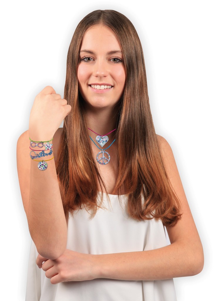 Výtvarná sada určená zejména všem princeznám a parádnicím, které touží po vlastnoručně vyrobeném šperku. Nechejte děti zábavně zdokonalovat své dovednosti a sestavovat šperky dle přiloženého návodu, nebo za použití vlastní fantazie. S pomocí potřeb dodávaných v sadě je to tak snadné! Sada obsahuje: 16 kovových štítků různých tvarů, 6 barevných provázků ze syntetické kůže, více než 650 kamínků, 8 lahviček se třpytkami, 1 lahvičku lepidla, štětec, pinzetu a kartonový šperkový strom (24x23,5 cm). Hlavní vlastnosti: rozvíjí kreativitu a vyjadřovací schopnostipraktické balení