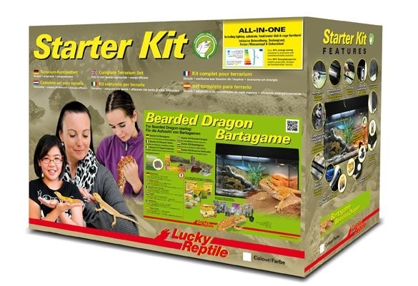Starter Kit Bearded Dragon je skleněné terárium ve dvou barevných provedeních, černé a bílé. Obsahuje vše, co je třeba pro začátek chovu mláďat agam vousatých, včetně osvětlení, dekorací, plakátu na pozadí, substrátu a misky na krmení. Součástí balení je brožurka a/nebo DVD v cizím jazyce o chovu agam.