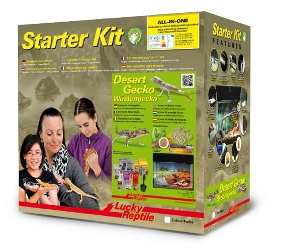 Starter Kit Desert Gecko je skleněné terárium ve dvou barevných provedeních, černé a bílé. Obsahuje vše, co je třeba pro začátek chovu malých pouštních gekonů, včetně osvětlení, dekorací, plakátu na pozadí, substrátu a misky na krmení. Součástí balení je brožurka a/nebo DVD v cizím jazyce o chovu gekonů.