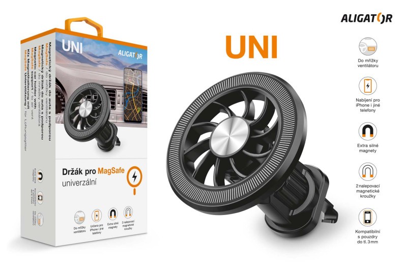Kompaktní zpracování v klasické černé barvě s možností nastavení úhlu a dvěma feromagnetickýma samolepkama, díky kterým můžete rozšířit kompatibilitu u pouzder, které tuto technologii nepodporují. To vše je Držák Aligator pro MagSafe.