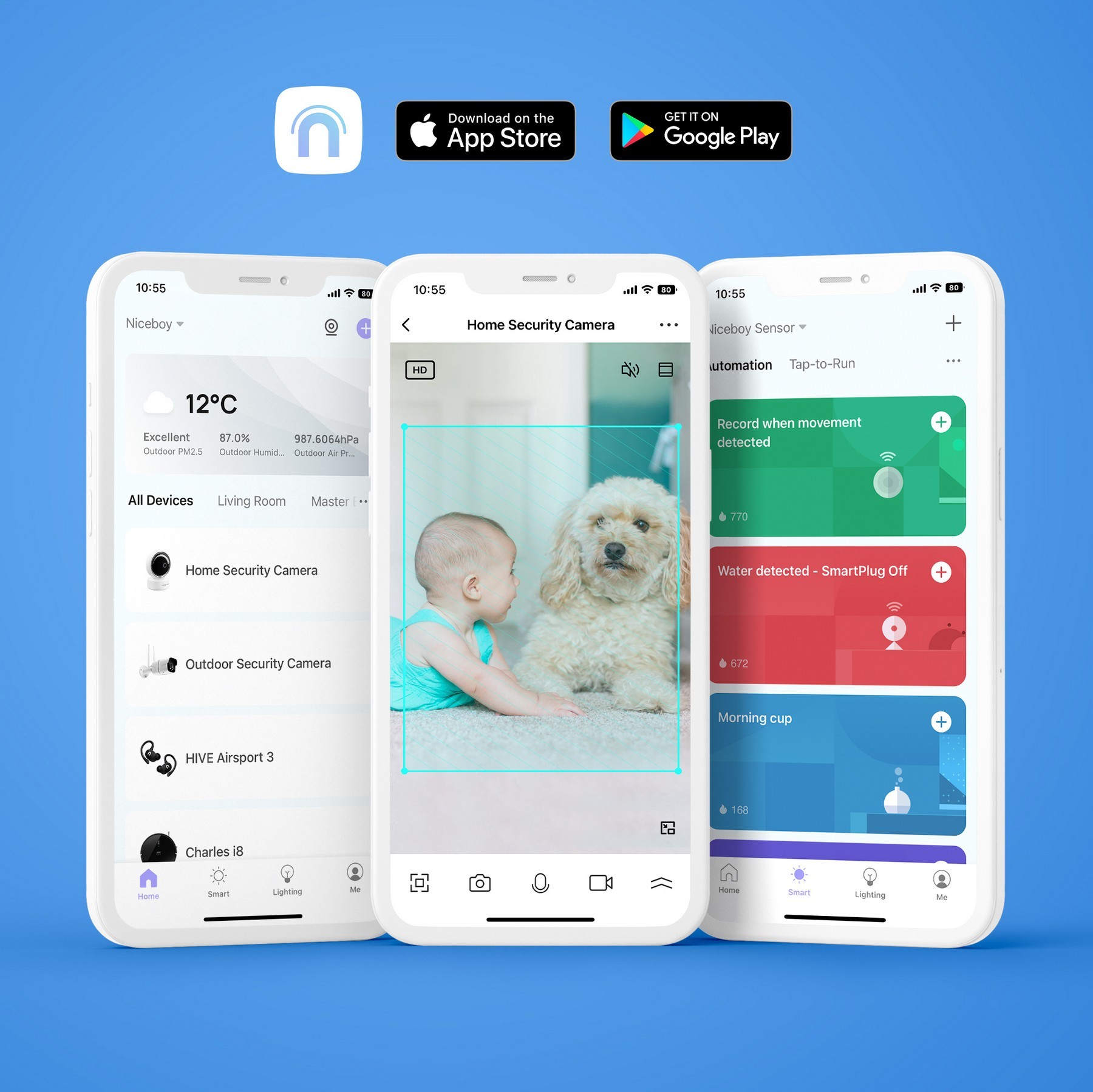 Kamera je stejně jako ostatní zařízení chytré domácnosti ION propojena s mobilní aplikací Niceboy ION. V ní si jednoduše a rychle nastavíte vše, co a jak potřebujete. Můžete kameru ovládat a sledovat v reálném čase dění, které snímá, i si v ní přehrávat starší záznamy. Aplikace vám také bude zasílat upozornění, když se něco změní nebo když kamera vyhodnotí nějakou situaci hodnou zvýšené pozornosti. Na vás už je jen, abyste si vymysleli a stanovili scénáře či časové plány, podle kterých se bude kamera řídit. V aplikaci ION může kameru ovládat i kdokoliv další z rodiny.