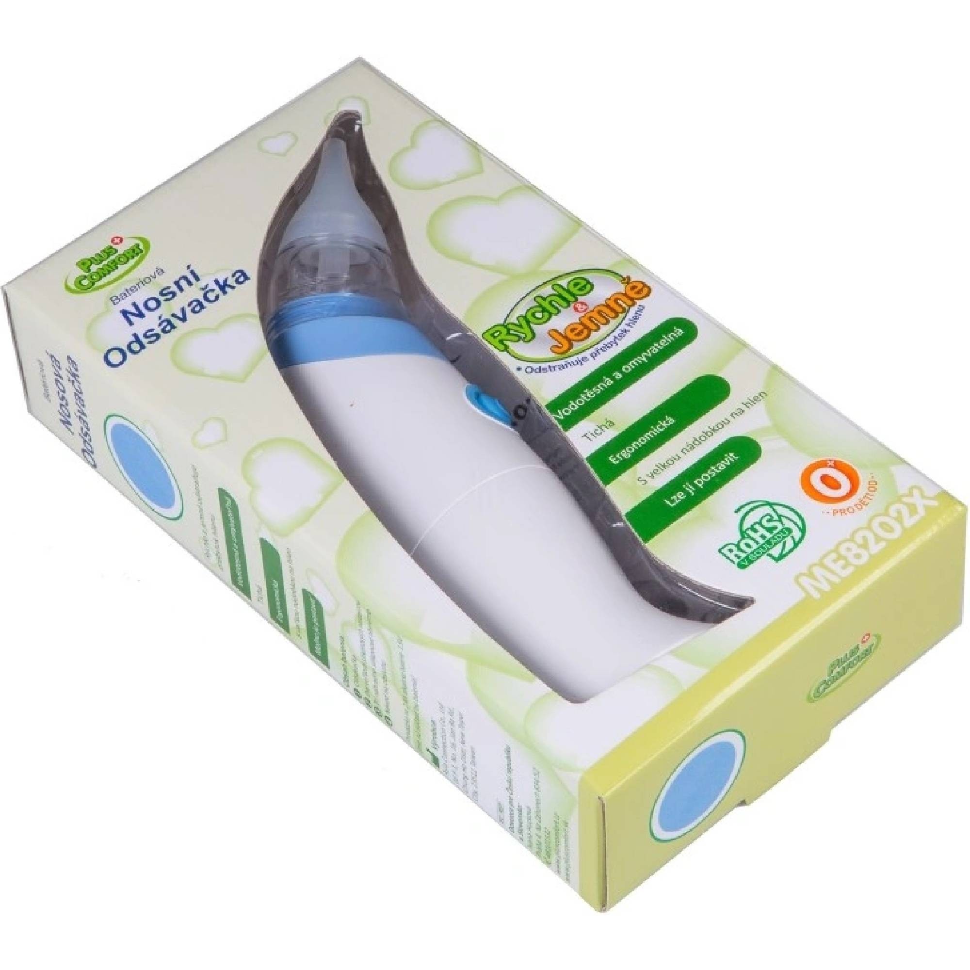 Bateriová odsávačka nosních hlenů Comfort Plus pro snadné a rychlé čištění dětských i dospělých nosních dírek. Rychle a šetrně odstraňuje hlen, čímž pomáhá ke zmírnění infekce horních cest dýchacích. Jednoduché použití. Přístroj je vodotěsný, nehlučný a má ergonomický tvar umožňující pohodlné uchopení. V balení jsou 2 velikosti silikonových nástavců.