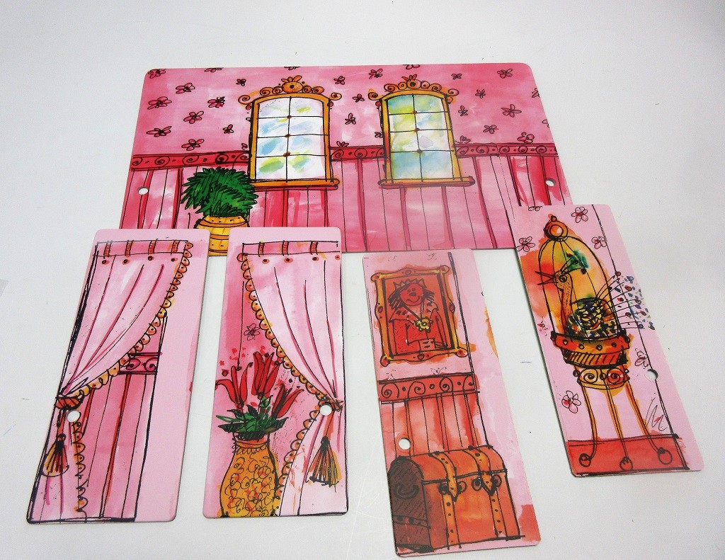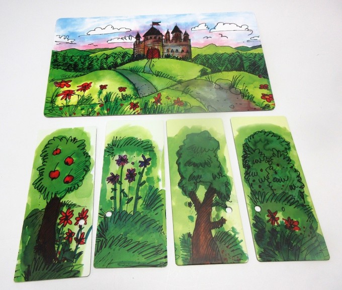 Nabízíme oboustrannou scénu a boční scény pro Gerlichovo loutkové divadlo představující pohled z lesa na královský zámek a krásnou komnatu uvnitř královského zámku. Hlavní vlastnosti: Rozměry hlavní scény jsou 40x23 cm, 4ks boční kulisa 9,5x23 cmTato scéna je určena pro Gerlichova loutkové divadla
