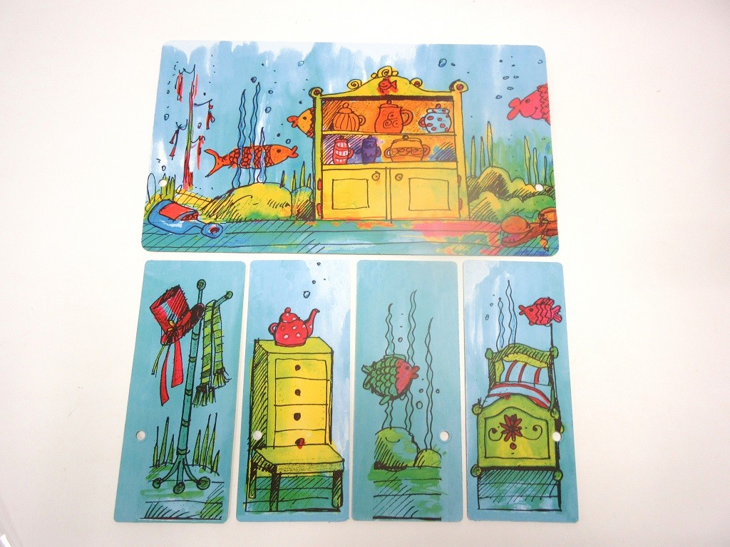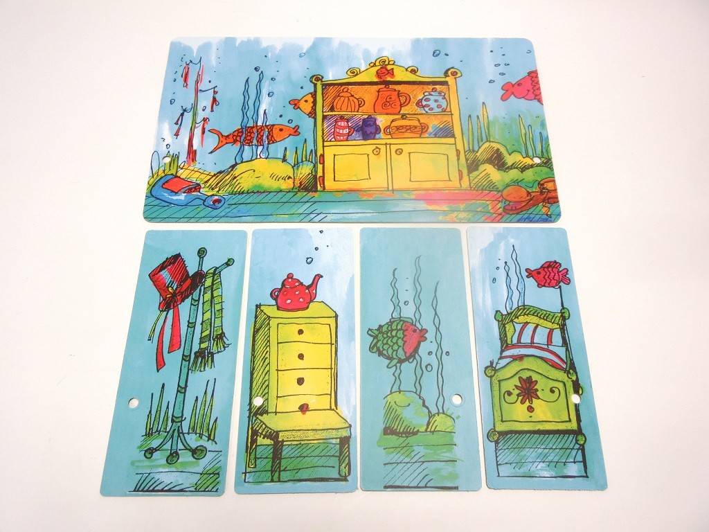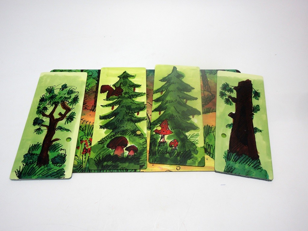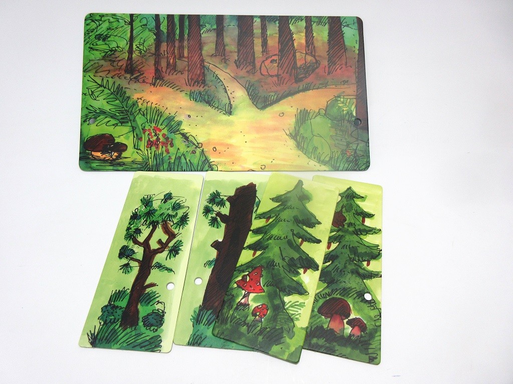 Oboustranná scéna pro Gerlichovo loutkové divadlo představující tajuplné lesní rozcestí a vodníkův podvodní příbytek plný hrníčků. Hlavní vlastnosti: Rozměry hlavní scény jsou 40x23 cm, boční panely 4ks 9,5x23cm Oboustranná scéna pro gerlichova divadla