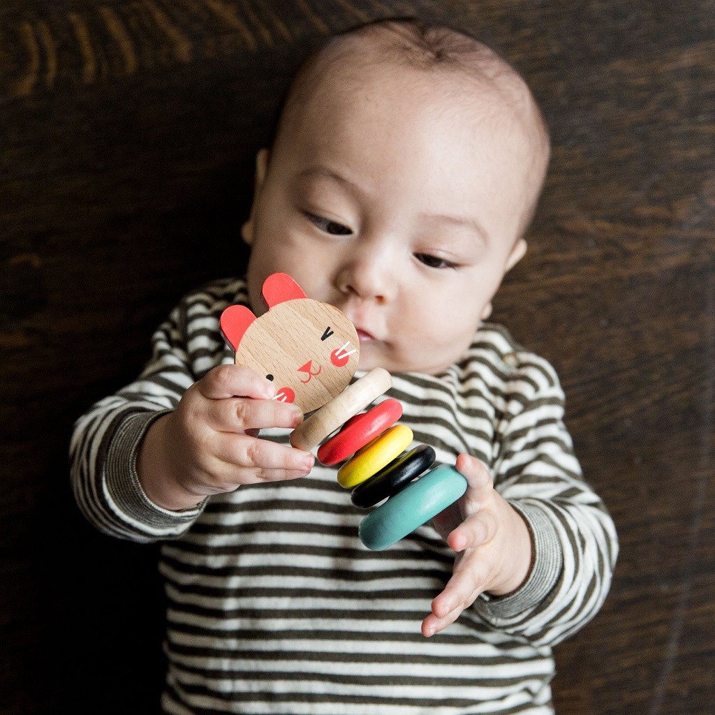 Barevné chrastítko vydává při jemném otřesu uklidňující zvuk klepání. Pět hladkých prstenů z bukového dřeva je ideální pro uchopení dětskými ručičkami. Zářivé barvy a vzory vyvolávají v dětech zvídavost a zajíčka si oblíbí každé malé dítě.  Hlavní vlastnosti: Vyrobeno z certifikovaného dřeva a barveno netoxickými přírodními barvami na vodní báziOdpovídá standardům CPSIA, ASTM, EU a CE    Značka a certifikát FSC® (Forest Stewardship Council) zaručuje, že dřevo, ze kterého byl produkt vyroben, nebylo vytěženo nelegálně a pochází z lesů obhospodařovaných šetrným či přírodě blízkým způsobem, ve kterém jsou dodržovány přísné environmentální a sociální požadavky. Značka FSC® na výrobku znamená, že svým nákupem pomáháte chránit lesy a podporujete šetrné, odpovědné či přírodě blízké hospodaření, díky kterému jsou naše lesy stabilnější, zdravější, mají přirozenou druhovou skladbu a lépe odolávají negativním následkům klimatických změn.