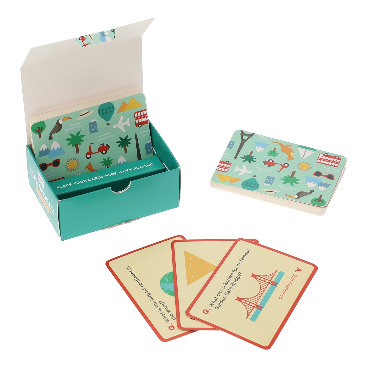 Staňte se světoběžníky s touto kvízovou hrou. Snadno s ní můžete dětem rozšířit obzory a pomáhat s učením, poslouží jako zpestření k listování atlasem, nebo cestování po glóbusu. Každá z originálně ilustrovaných karet obsahuje zeměpisnou otázku s odpovědí, například: „Které město je známé svým slavným mostem Golden Gate?“ Hra je v anglickém jazyce a je vhodnou pomůckou k procvičování angličtiny. Skvělá zábava na cesty i pro deštivé dny trávené doma! Hlavní vlastnosti:50 karet s kvízovými otázkamivhodné k procvičování angličtinyvyrobeno ze 100% FSC® certifikovaného papírupotištěno rostlinnými inkousty Značka a certifikát FSC® (Forest Stewardship Council) zaručuje, že dřevo, ze kterého byl produkt vyroben, nebylo vytěženo nelegálně a pochází z lesů obhospodařovaných šetrným či přírodě blízkým způsobem, ve kterém jsou dodržovány přísné environmentální a sociální požadavky. Značka FSC® na výrobku znamená, že svým nákupem pomáháte chránit lesy a podporujete šetrné, odpovědné či přírodě blízké hospodaření, díky kterému jsou naše lesy stabilnější, zdravější, mají přirozenou druhovou skladbu a lépe odolávají negativním následkům klimatických změn.
