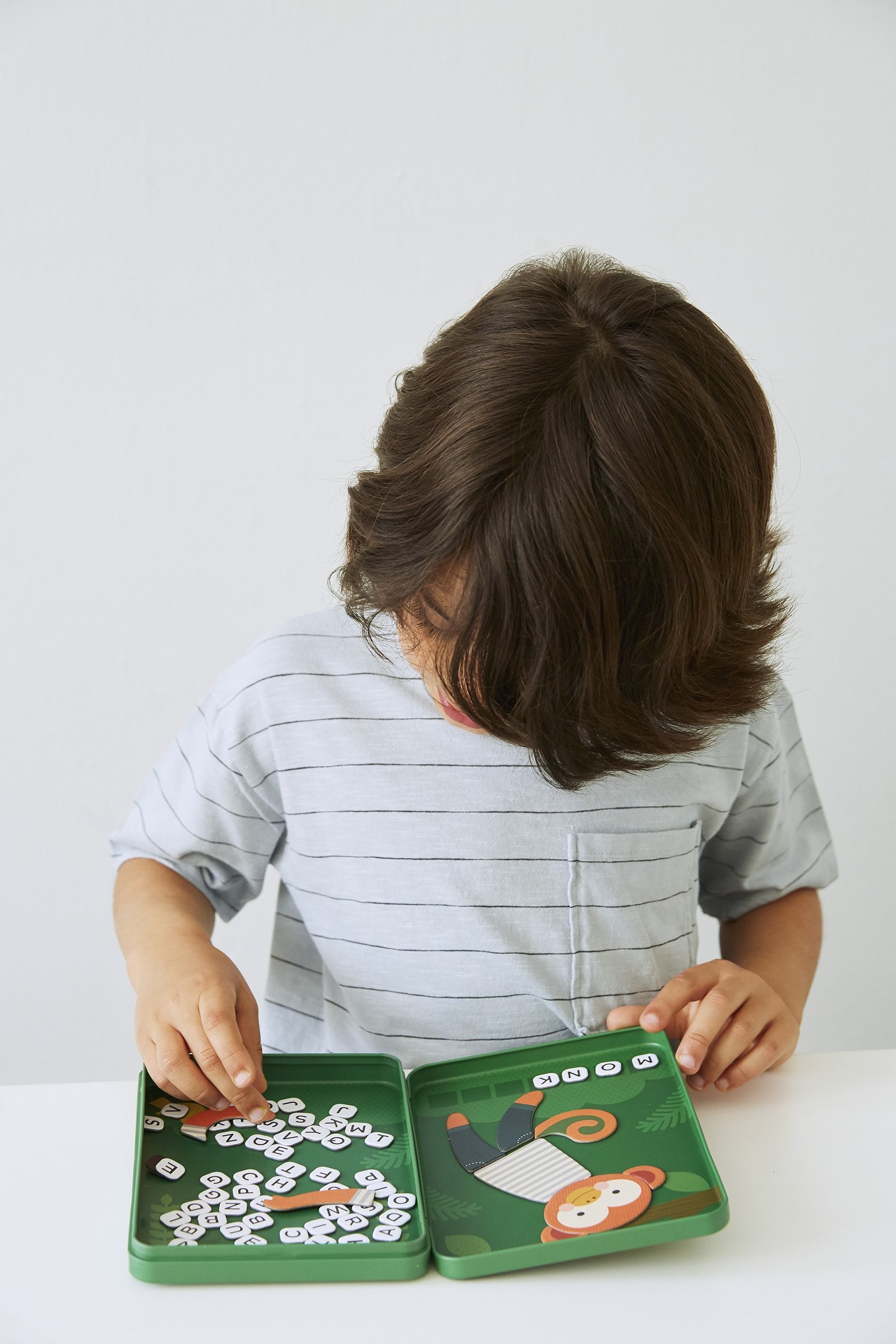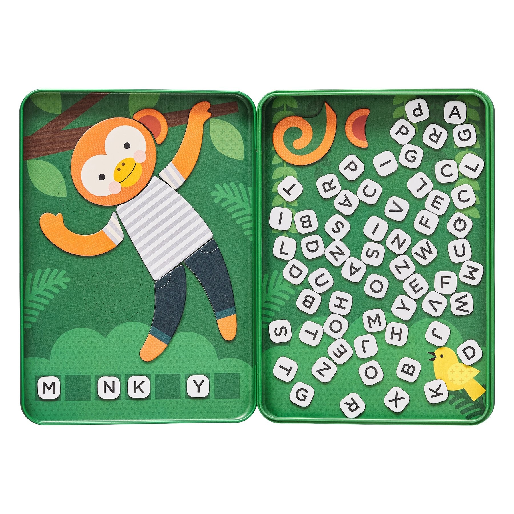 Uhodněte tajné slovo svého spoluhráče dříve, než dokončí obrázek opičky! S touto cestovní magnetickou hrou si děti rozvinou slovní zásobu – je to v podstatě vylepšená hra šibenice...  Hlavní vlastnosti: Skvělá cestovní hračka v kovové krabičce Natištěno netoxickými barvami, které berou v potaz zdraví dětí a planetu