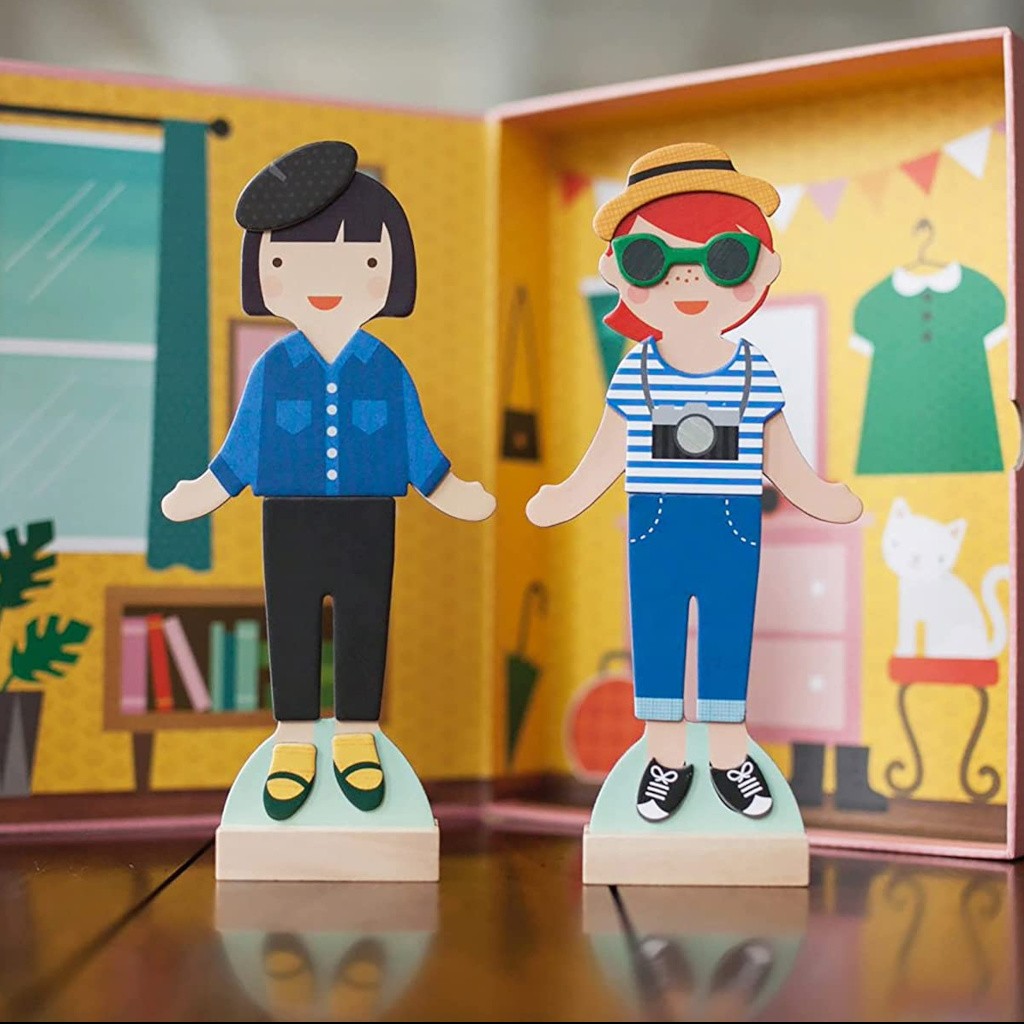 Sada oblékacích dívek v krabičce uzavíratelné magnetem s 27 ks magnetických částí - dopřejte Vašemu dítěti vytvořit až 80 různých kreativních kombinací moderních outfitů.  Hlavní vlastnosti: 2 velké dívky 2 dřevěné stojánky27 magnetických částí