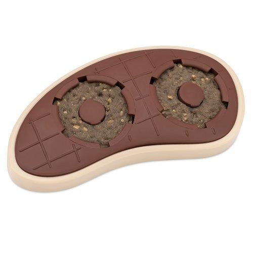 „Jak byste si dal Váš steak, pane?" Tato otázka Vás jistě napadne, když budete tuto hračku servírovat Vašemu čtyřnohému příteli. A i když neumí odpovědět, jsme si zcela jisti, že se mu to bude líbit právě takhle, s náplněmi do hraček Busy Buddy® nahoře. Díky dvěma speciálním úchytům SnapFit™ můžete do hračky vložit až dvě tyto náplně najednou. Pro ještě větší zábavu můžete drážky na zadní straně steaku natřít ořechovým máslem (nebo čímkoli co má Váš pes rád), aby se zabavil ještě déle. Texturovaný povrch zabraňuje usazování zbytků při žvýkání, odstraňuje usazeniny a pomáhá tak udržovat zuby a dásně čisté. Je to takový chytrý zubní kartáček, který vypadá a chutná jako snack – geniální, my víme. Guma použita při výrobě této hračky je bez BPA a má vůni hovězího masa. To vše jen pro to, aby byl Váš pes šťastný i po konzumaci náplní, které jste mu tam dali. A abychom Vám usnadnili život, hračka se jednoduše čistí a je vhodná i do myčky na nádobí.