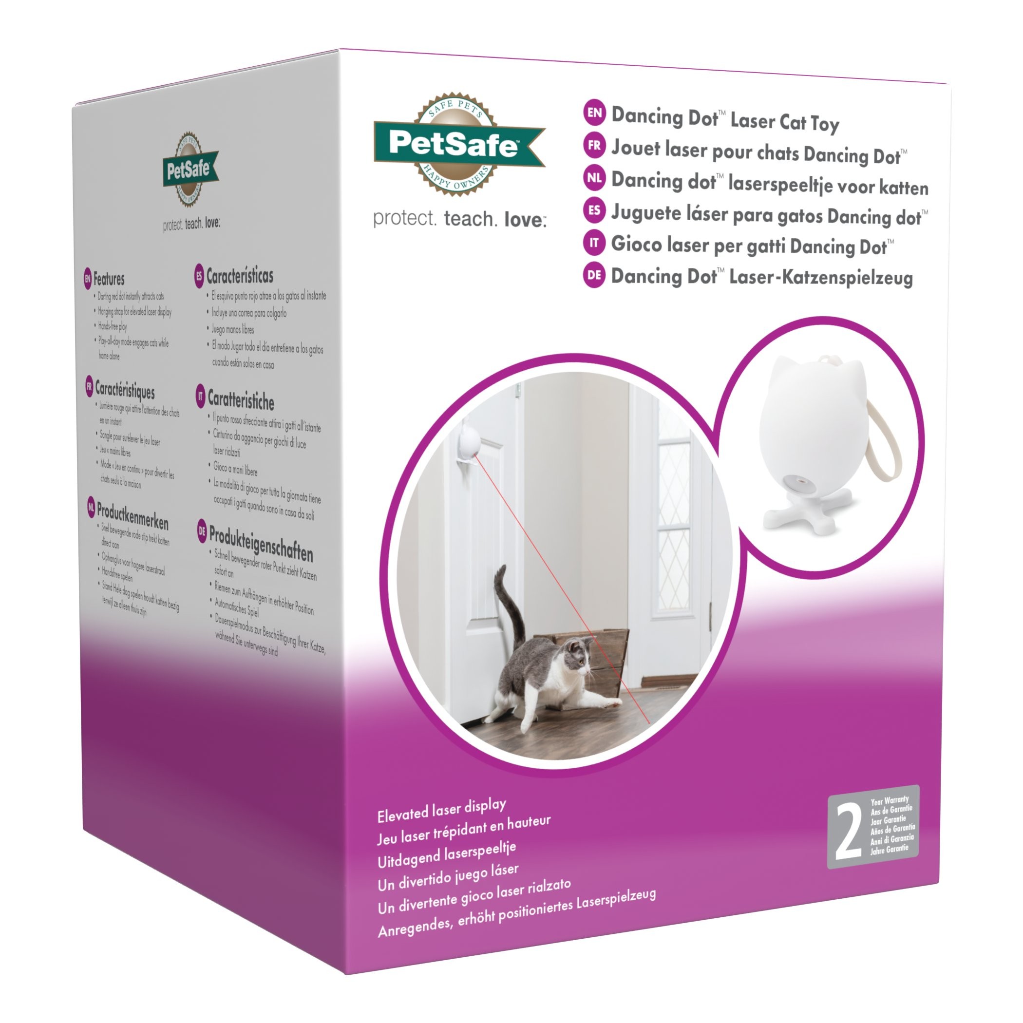 PetSafe® Dancing Dot™ je poutavá hračka pro kočky. Náhodné vzory a pohyby laseru udržují zájem Vaší kočky tím, že stimulují její přirozené instinkty k pronásledování a lovení. Nechte své kotě skákat a hrát si celý den (i když nejste doma). S touto laserovou hračkou má o zábavu postaráno. Jednoduše umístěte hračku na jakýkoli vyvýšený rovný povrch nebo ji zavěste na kliku dveří. Díky dvěma možnostem režimu přehrávání a náhodnému pohyblivému laserovému paprsku je hračka zábavným způsobem, jak udržet Vaši kočku zdravou a aktivní.