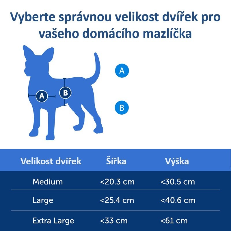 Velikost dvířek Hmotnost psa Maximální šířka ramen psa Celková velikost dvířek Velikost otvoru Velikost montážního otvoru