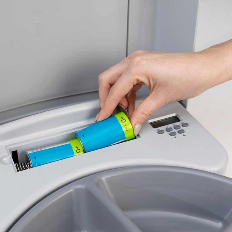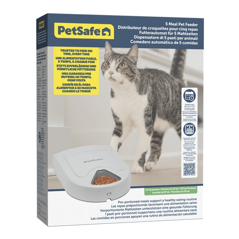 Bateriové krmítko s LCD displejem na 5 porcí krmiva, pamlsků či léků. Pomocí digitálních hodin si můžete naplánovat výdej 5 porcí v jednom dni nebo je rozložit až na 5 následujících dní. Skvělý pomocník pro kontrolu porcí (např. pro mazlíčky s nadváhou). Krmítko má odnímatelný podnos s 5 přihrádkami, z nichž každá pojme 1 šálek (236 ml) suchého nebo polovlhkého krmiva. Čas krmení si můžete vybrat s přesností na minutu. Po nastavení rozvrhu se budou automaticky podávat každý den ve stejnou dobu. Když krmítko naplníte, jedna porce je okamžitě k dispozici. Až přijde čas na další jídlo, podnos se otočí, čímž Váš mazlíček získá přístup k další porci. Pokud má mazlíček tendenci hltat, nebo chcete-li mu pomoci při udržování ideální hmotnosti, použijte PetSafe® 5-Meal Pet Feeder k naplánování menších porcí, aby zůstal zdravý a v dobré kondici.