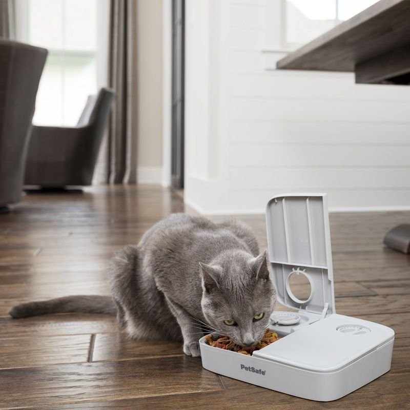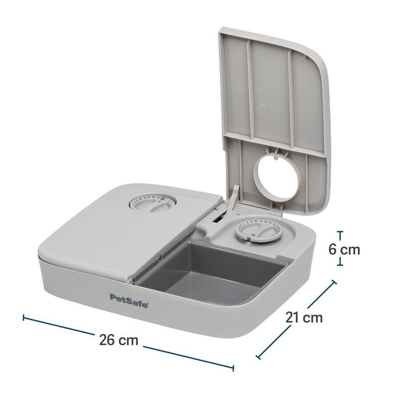 Přijdete domů později? Nebojte se! Pomůžeme Vám zajistit, aby Váš mazlíček už nikdy nezůstal hladem. Automatické krmítko PetSafe® nakrmí Vašeho domácího mazlíčka včas, ať už jste doma nebo ne. Pomocí časovačů pohodlně naplánujte krmení Vaší kočky nebo psa až 24 hodin předem (půlhodinové intervaly). Vyjímatelný vnitřní tác obsahuje 2 přihrádky, z nichž každá pojme až 355 ml suchého nebo polovlhkého krmiva. Váš mazlíček se sice může snažit, aby se ke své porci dostal dřív, než jste naplánovali, ale díky odolným víčkům se to nepodaří ani těm nejvytrvalejším nedočkavcům. Jistě Vás potěší i snadná údržba - když je potřeba zásobníky vyčistit, jednoduše je vyjměte a umyjte v horním koši myčky nádobí.