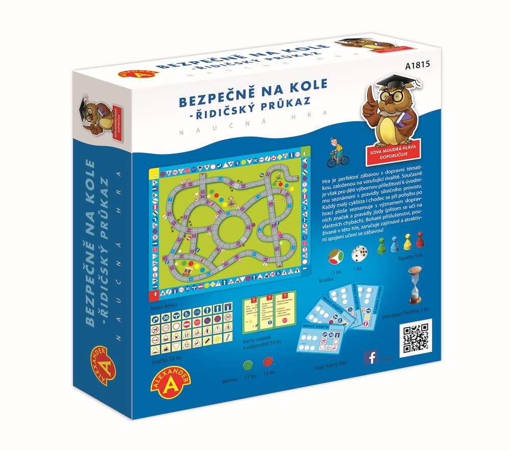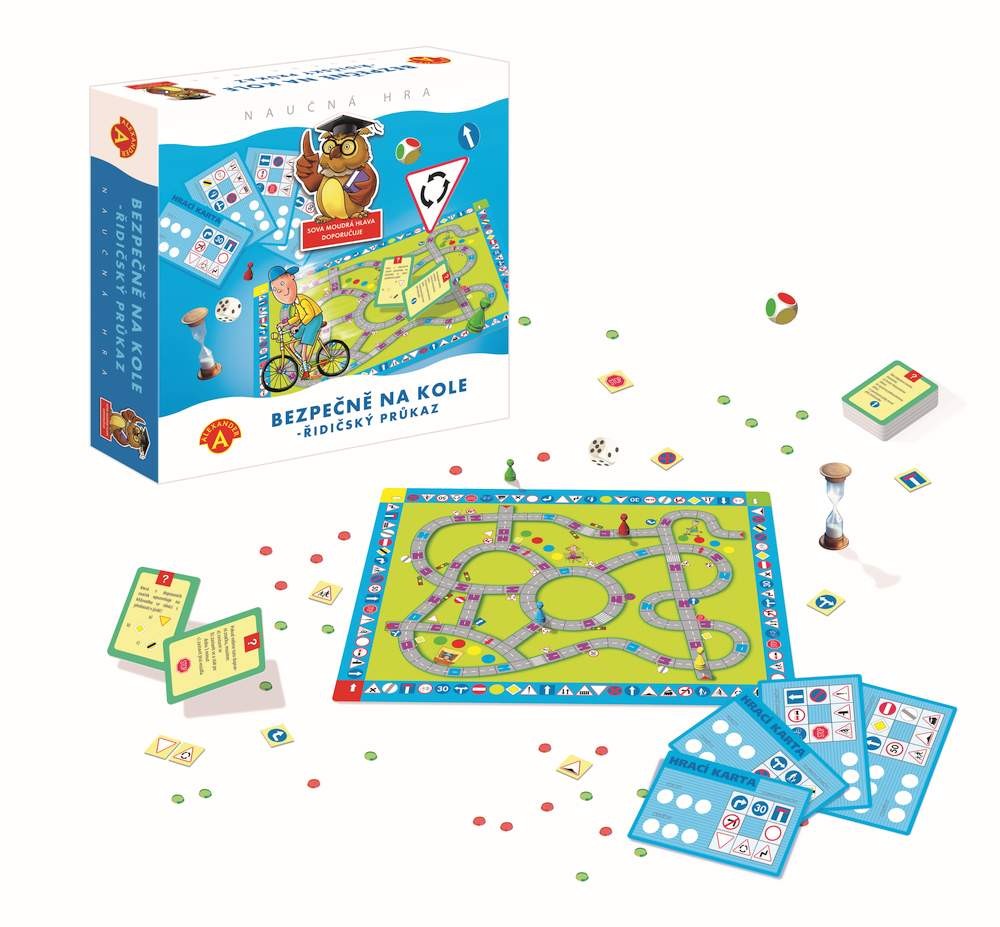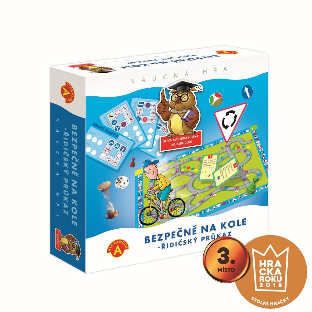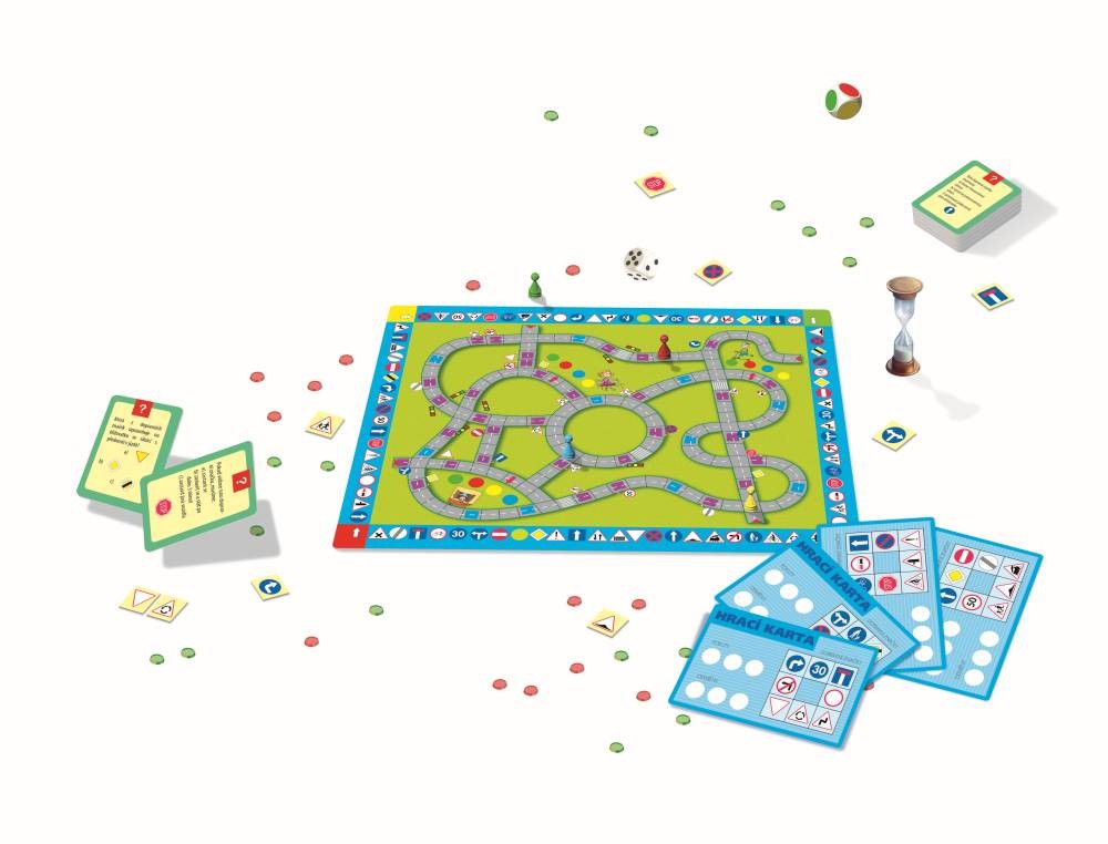 Oceněná HAČKA ROKU 2018 v ČR-3.místo. Nezbytná hra pro každého malého cyklistu. Je výbornou příležitostí, pro děti od 7 let, k úvodnímu seznámení s pravidly, než vyrazí do opravdového silničního provozu. Dospělí si zopakují, co by měli o dopravě vědět a dokonce často zjistí, že ne vždy se chovají správně! Sbírejte pokuty nebo odměny a učte se pravidla. Víte kdy můžete jezdit po chodníku a kdy je bicykl silnější než kamion? Každý hráč se při pohybu po hrací ploše seznamuje s významem dopravních značek a pravidly jízdy (přitom se učí na vlastních chybách). Bohaté příslušenství, používané v této hře, zaručuje zajímavé a atraktivní spojení učení se zábavou! Opakované hraní hry zajistí zlepšení znalostí o silniční dopravě a zvýšení jistoty malých cyklistů při pohybu v silničním provozu. Princip hry: I. etapaV I. etapě musí každá z hráčů získat 8 různých dopravních značek (podle rozdané Hrací karty). Pro nasbírání všech 8 dopravních značek je nutné mít znalosti o dopravních značkách. Hra začíná na vnější dráze složené z políček (dopravních značek), umístěných kolem desky. Hráč hodí vždy hrací a barevnou kostkou a posune svou figurku po směru hodinových ručiček. Barevná kostka zvyšuje možnosti pohybů hráče, a tím také šance na rychlejší získání potřebných značek. Zastaví-li se hráč na políčku se značkou, musí povědět, k jaké skupině značek patří (např. k výstražným značkám´´) a co znamená (např. ,,Křižovatka´´) Pokud je odpověď špatná, hráč nic nezískává a na řadě je další hráč. Pokud je odpověď správná, hráč získává z krabičky stejnou značku, kteoru si odloží na svou hrací kartu. Hráč po získání všech značek, které má na své kartě, ukončuje I. etapu. a přenese se z políčka, na kterém ,,získal´´ poslední, osmou značku, na šedé pole s červeným trojúhelníkem, které je nejblíže po pravé straně hráče a které zahajuje trasu II. etapy. II. etapa: V II. etapě hry se účastníci seznámí s pravidly silničního provozu a osvojují si význam dopravních značek. Je důležité se vžy pohybovat podle silničního značení. Pro hráče jsou závazné značky umístěné po pravé straně silnice a jeho směru pohybu. Hráč, který v II. etapě pojede v rozporu s předpisy a bude při tom ,, přistižen´´ jedním z hráčů, obdrží ,,POKUTU´´. Každý musí zvolit trasu tak, aby co nejrychleji rozvezl 3 odměny, které má na své Hrací kartě pro každého ze svých přátel, ale musí při tom získat alespoň 3 Karty otázek a odpovědí. Vyhrává hráč, který jako první nashromáždí (v libovolném pořadí) 3 karty Otázek a Odpovědí a rozmístí na desce všechny 3 odměny. Obsah balení: hrací deska 1 ksbarevné figurky 4 ksžetony dopravní značky 32 ksherní karty hodnocení 4 kskarty Otázek a Odpovědí 55 kshrací kostka 1 ksbarevná kostka 1 kspřesýpací hodiny 1 kspokuty 12 ks červených žetonůodměny 12 ks zelených žetonůčeský návod ke hře 1ks Hlavní vlastnosti: vhodná i pro výuku ve školách učení pravidel bez nebezpečí nehody na vlastních chybách se učí děti nejrychleji hra využívá aktuální platná dopravní pravidla