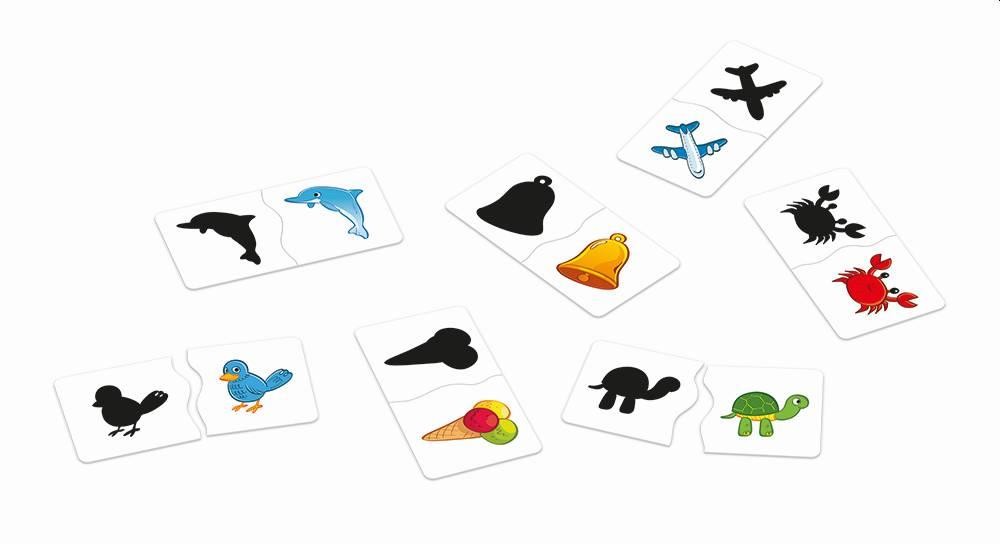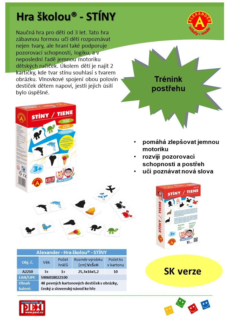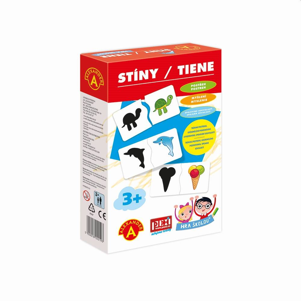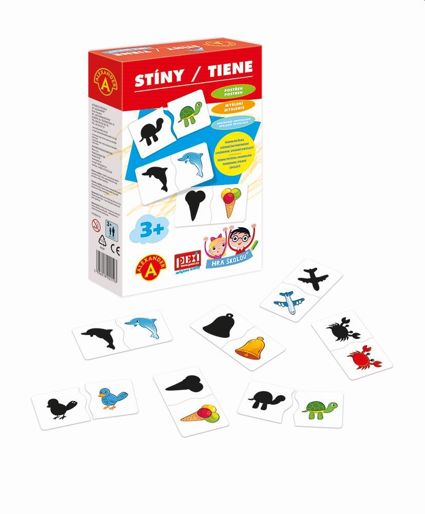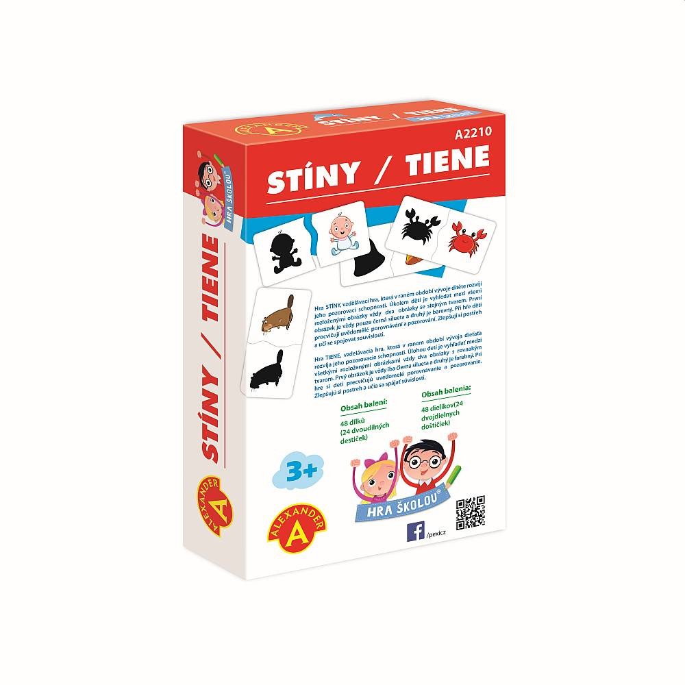 Hra školou Stíny je kreslená naučná stolní hra pro děti od 3 let rozvíjí kombinační schopnosti, pozorování a postřeh.  Sestav a poznej 24 dvojic složených ze stínu a barevného obrázku zvířat, hudebních nástrojů a věcí z každodenního života. Poznáš zvířátka nebo hudební nástroje jen podle obrysu? Sestav 24 párů jako puzzle a pokračuj ve hře.  Oblíbená hra z edice Hra školou®.  Zábava i pro maminky a tatínky. Jak vypadá obrys kachněte? V čem se liší od kuřátka? Váháte? Poznávejte svět společně! Kolik nápadů, tolik variant. Jak dítě poroste, stane se hra čím dál zábavnější. Pro nejmenší (od 3 let) Nechte dítě složit dvojice a prohlížet si obrázky. Střední obtížnost: Ukazujte si konkrétní zvířata, hudební nástroje a věci z obrázků a povídejte si o nich.  Zvídavé otázky pro chytré hlavičky: Ptejte se a společně zjišťujte třeba: Kolik zvířátek najdeš mezi motivy? Která žijí v moři? Které věci z obrázků máme doma? Kolik vidíš hudebních nástrojů? Co jedí zvířátka z obrázků?  Sestav a poznej všech 24 motivů! Zábavnou formou se tak děti učí rozpoznávat nejen tvary, ale hraní také podporuje pozorovací schopnosti, logiku, a v neposlední řadě jemnou motoriku dětských ručiček.  Hlavní vlastnosti: Nekonečná zábava. Sestavte společně dvojice a povězte si o nich co nejvíc. K hraní kdykoli a kdekoli. Vezměte kartičky s sebou na návštěvu i do čekárny. Stačí rozbalit a hrát. Rozvoj kombinačních schopností, postřehu a pozorování. Hra stimuluje poznávací schopnosti dětí.  Dvojice samostatně sestaví děti zhruba od 3 let věku.