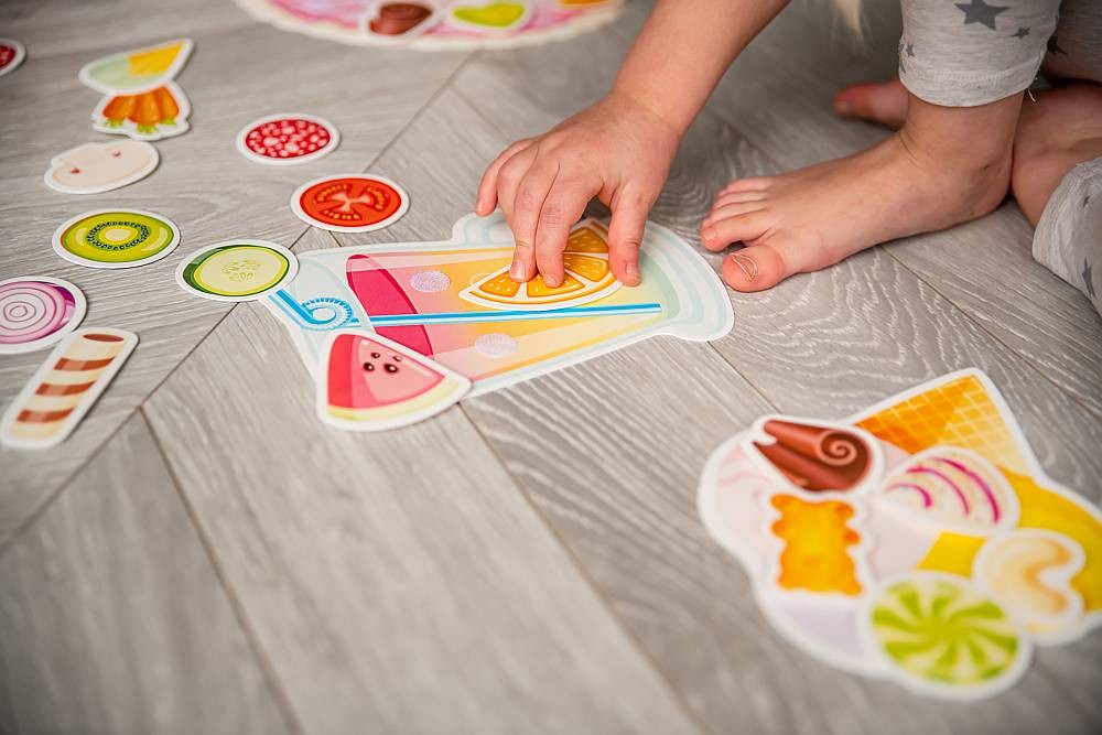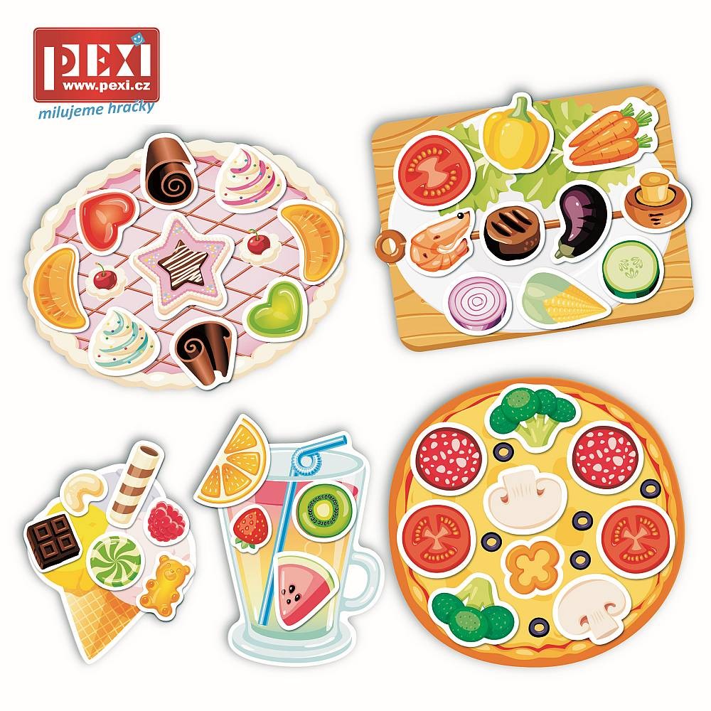 Při hraní s Velcro si užijete zábavu a zjistíte více o jídle a popovídate si o jeho chutích. Zároveň rozvíjíte svou kreativitu, mluvení a slovní zásobu, jemnou motoriku a koordinaci ruka-oko. K dispozici máte pizzu, zmrzlinu, limonádu, dort, salát a dalších předměty - celkem 38 ks. Máte raději pizzu nebo zmrzlinu? Přidáte si rajče do limonády? :-) Co je uvnitř?Sada obsahuje 5 pružných plastových destiček se suchým zipem a 38 samostatných dílků, které umístíte na destičky pomocí suchého zipu. Díky této vychytávce jednotlivé díly jen tak nespadnou a budou držet na správném místě. Všechny části jsou vyrobené z odolného, ale tenkého plastu se speciální povrchovou úpravou, která je dětem příjemná na dotek. Jak hrát? Berte jednotlivé dílky jeden po druhém a povídejte dětem co na nich je.Potom vezměte destičku s obrysy předmětů a vybídněte dítě, aby našlo správný předmět pro každý obrys a připevnilo ho pomocí suchého zipu na správné místo.Popustťe uzdu fantazii a začněte vařit. Kombinujte, míchejte a vyzkoušejte různé potraviny a nechte se překvapit, co vše si děti vymyslí za recepty. Povídejte si společně, jak by výtvory asi chutnaly.Nezbývá než popřát dobrou chuť! Hlavní vlastnosti: zlepšuje motorické schopnosti trénuje vyjadřování a mluvenou řeč rozvíjí myšlení a paměť upevňuje udržení pozornosti