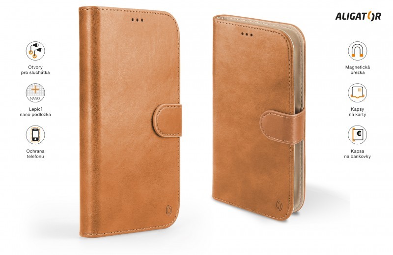 Dokonale propracovaný design, tenké provedení, přihrádka na kartu nebo vizitky, podélná kapsa na bankovky, zavírání pomocí magnetické přezky, snadné uchycení mobilního telefonu pomocí prémiové lepicí nano podložky, která je určena pro opakované umístění telefonu.