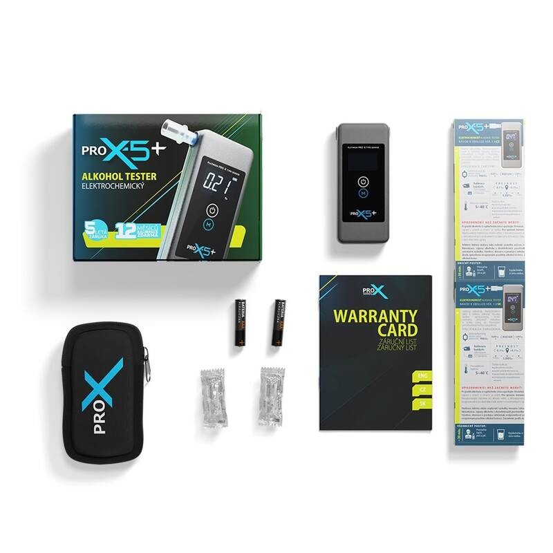 Alkoholtester PRO-X 5+ je určen k dechovému testování alkoholu pomocí náustku. Po zapnutí se přístroj automaticky připraví k měření. Výsledek testu je signalizován vizuálně i zvukově. Po dokončení měření se zařízení automaticky vypne. Vestavěné počítadlo umožňuje sledovat celkový počet provedených testů.