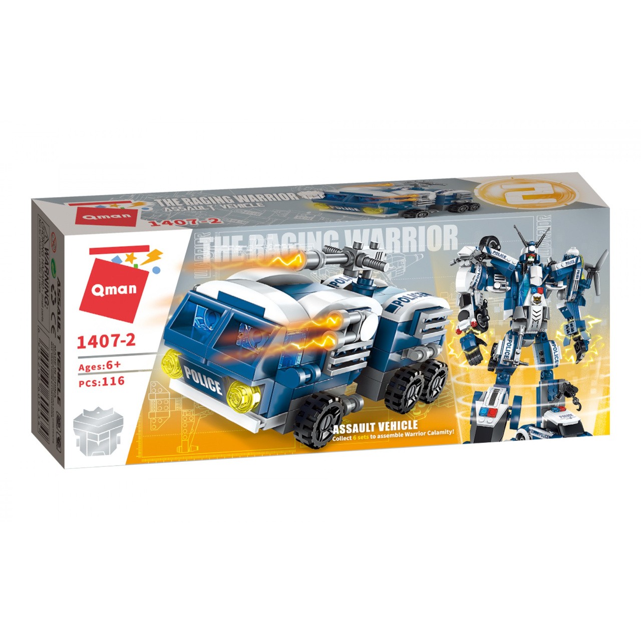 Sbírejte, kombinujte a pozvedejte stavbu i hru na vyšší úroveň! Ministavebnice policejní techniky ze série Raging Warrior, jejíž kompletací vznikne možnost sestavit velký ucelený model robotického strážce zákona. Vysoce variabilní stavebnice Qman z pestrobarevných plastových kostiček lze kombinovat s podobnými stavebnicemi mnoha dalších významných výrobců. Vyrobeno z kvalitního, nezávadného a odolného ABS plastu. Baleno v pestře potištěné papírové krabičce.   Hlavní vlastnosti:116 dílkůkompletací série lze sestavit velký modelkompatibilní se stavebnicemi dalších výrobců