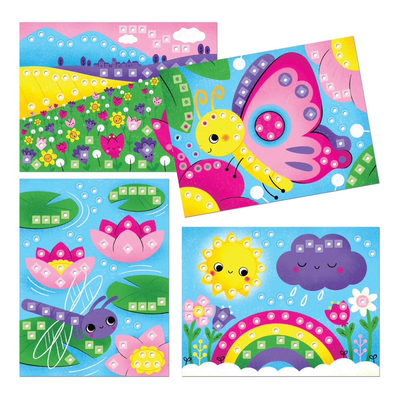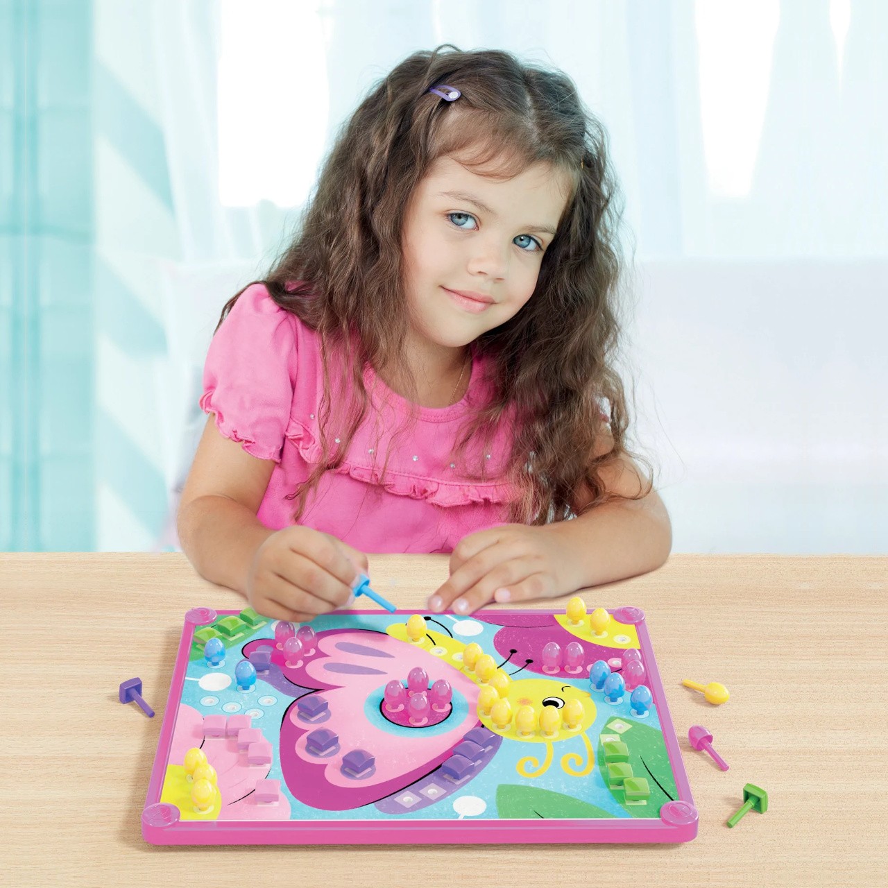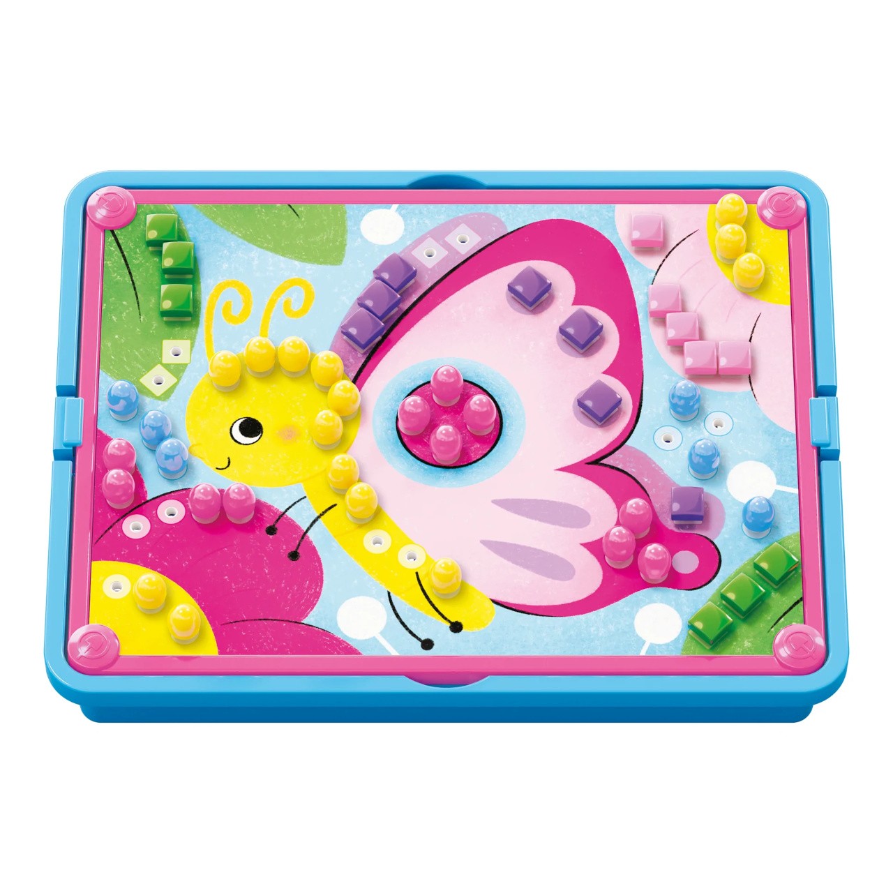 Kolíčková mozaika s úložným košem a 4 předtištěnými obrázkovými kartami pro zapichování kolíčků. Mozaika rozvíjející jemnou motoriku, koordinaci ruka-oko a kreativní myšlení. Skládá se ze 4 předtištěných, perforovaných karet, 180 barevných kolíčků, zapichovací podložky, úchytného rámu a úložného košíku. Doporučeno dětem od 3 let.  Obsah balení:1 úložný košík1 zapichovací podložka s otvory na kolíčky1 úchytný rám4 perforované karty s obrázky180 barevných zapichovacích kolíčků ve 2 tvarech a 6 barvách Hlavní vlastnosti: podporuje jemnou motorikukoordinaci ruka-okokreativní myšlení